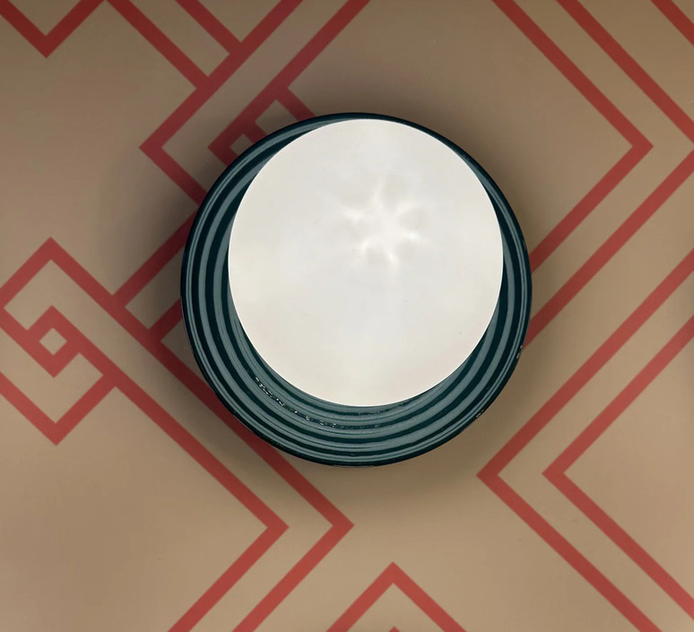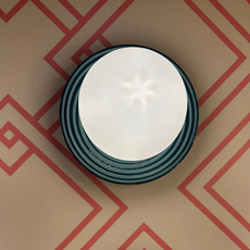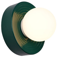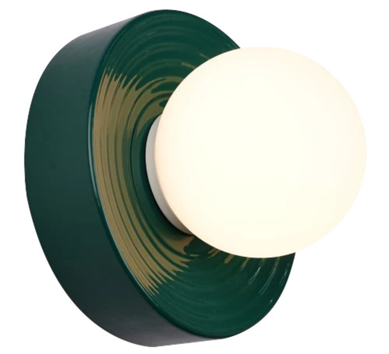 Das smaragdgrüne Finish verleiht der Leuchte einen Hauch von Pep, der einen subtilen Kontrast zu der sanften Opalglaskugel bildet. Die kreisförmige, strukturierte Form mit Rillen, die an Schallplatten erinnern, erinnert an einen ausgeprägten Memphis-Stil.