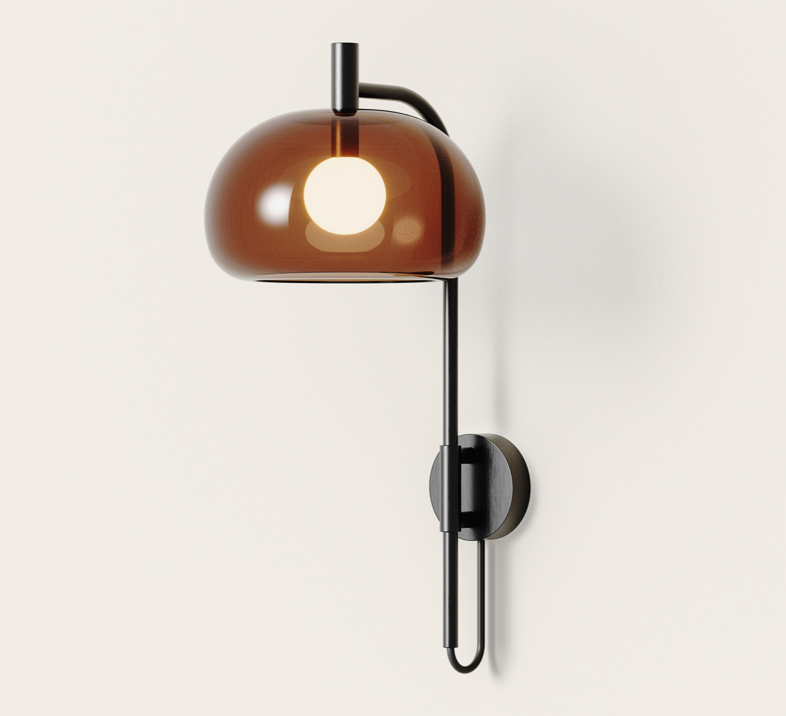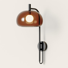Die Wandleuchte Cloud zeichnet sich durch ihre Struktur aus Metall mit mattem Noit-Finish aus, die einen großzügigen kugelförmigen Diffusor aus bernsteinfarbenem Glas trägt, dessen dezent rauchige Tönung das Licht sanft filtert. Ihre skulpturale Präsenz wertet eine Wohnzimmerwand, einen Flur oder ein Schlafzimmer auf und eignet sich als Kopfteil oder Akzentbeleuchtung. Sie passt sowohl zu anspruchsvollen Inneneinrichtungen als auch zu warmen, mineralischen und holzigen Tönen.