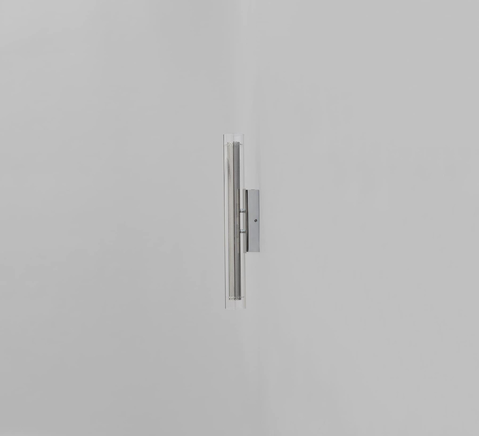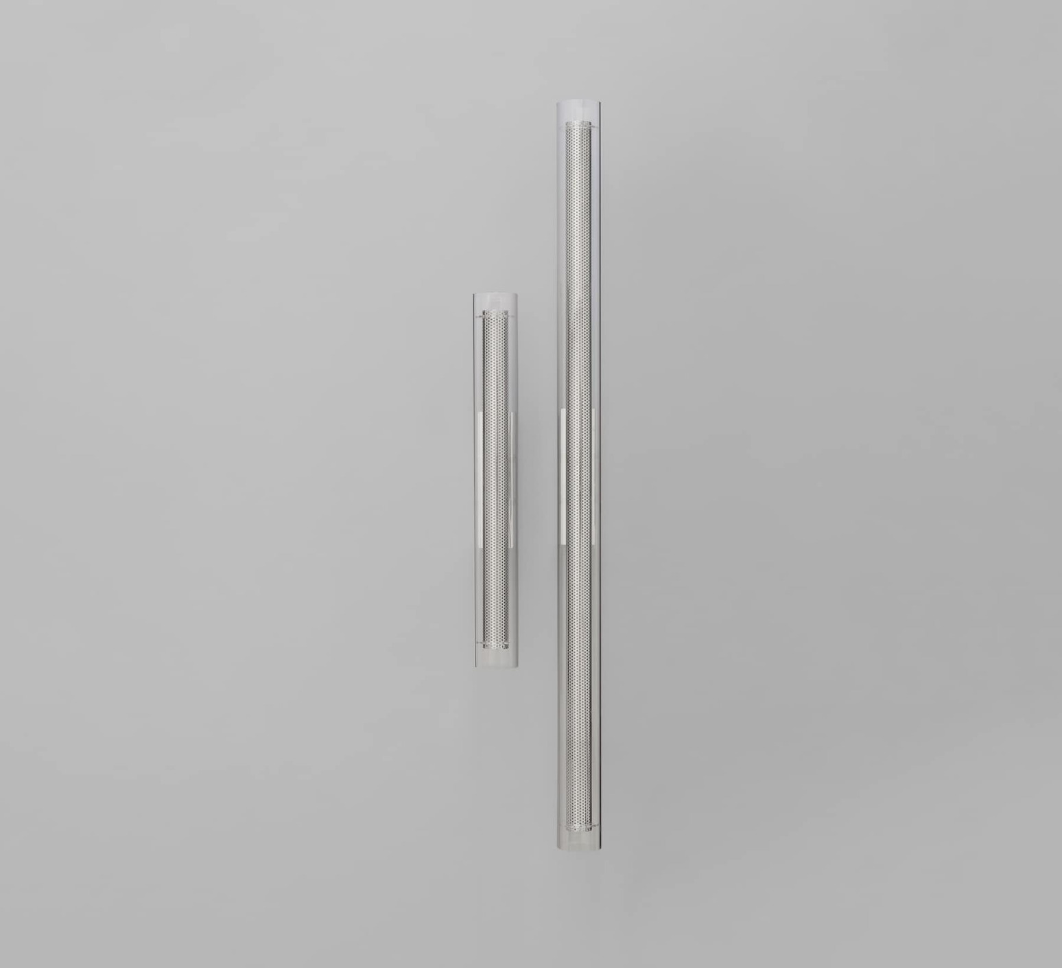 Die Wandleuchte Frame Big kombiniert einen perforierten Metallkörper mit einer Außenhülle aus transparentem Glas mit abgerundeten Enden und mildert die Strenge des Metalls ab, um einen fließenden und ausgewogenen Ausdruck zu bieten. Die Chromoberfläche reflektiert das Licht und betont die röhrenförmigen Linien des Designs, während die integrierte LED-Quelle ein warmes, gleichmäßiges 360°-Licht abgibt. Dieses Gleichgewicht zwischen industrieller Materie und visueller Weichheit verleiht der Wandleuchte eine starke dekorative Präsenz, die ideal ist, um einen Flur, ein Wohnzimmer oder einen Eingangsbereich zu beleuchten. Einzeln verwendet, zieht sie die Blicke wie ein skulpturales Stück auf sich; in Serie installiert, strukturiert sie den Raum mit Eleganz und Regelmäßigkeit.
