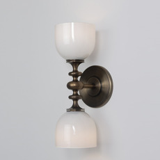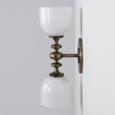 Ihr organisches Design kombiniert zwei nach oben und unten gerichtete, weiße, opake Kuppeln aus mundgeblasenem Glas, die durch eine Armatur aus antikem Messing mit fließenden, dekorativen Linien miteinander verbunden sind. Das Ganze bildet eine raffinierte und ausgewogene Silhouette, die sowohl klassisch als auch zeitgenössisch ist. Diese Wandleuchte passt ideal in ein Wohnzimmer, ein Schlafzimmer oder einen Flur, um einen eleganten und strukturierenden Lichtpunkt zu schaffen.