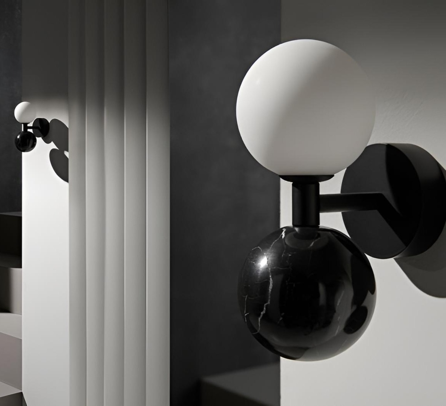 Sie kombiniert eine Metallstruktur mit einem Element aus massivem Marmor und einem Lampenschirm aus Opalglas und schafft so eine Silhouette, die die Reinheit der Volumen mit dem Reichtum der natürlichen Materialien verbindet. Diese Komposition erinnert sanft an eine leuchtende Kugel, die auf einem kostbaren Block sitzt, und verwandelt das Licht in eine raffinierte dekorative Präsenz.