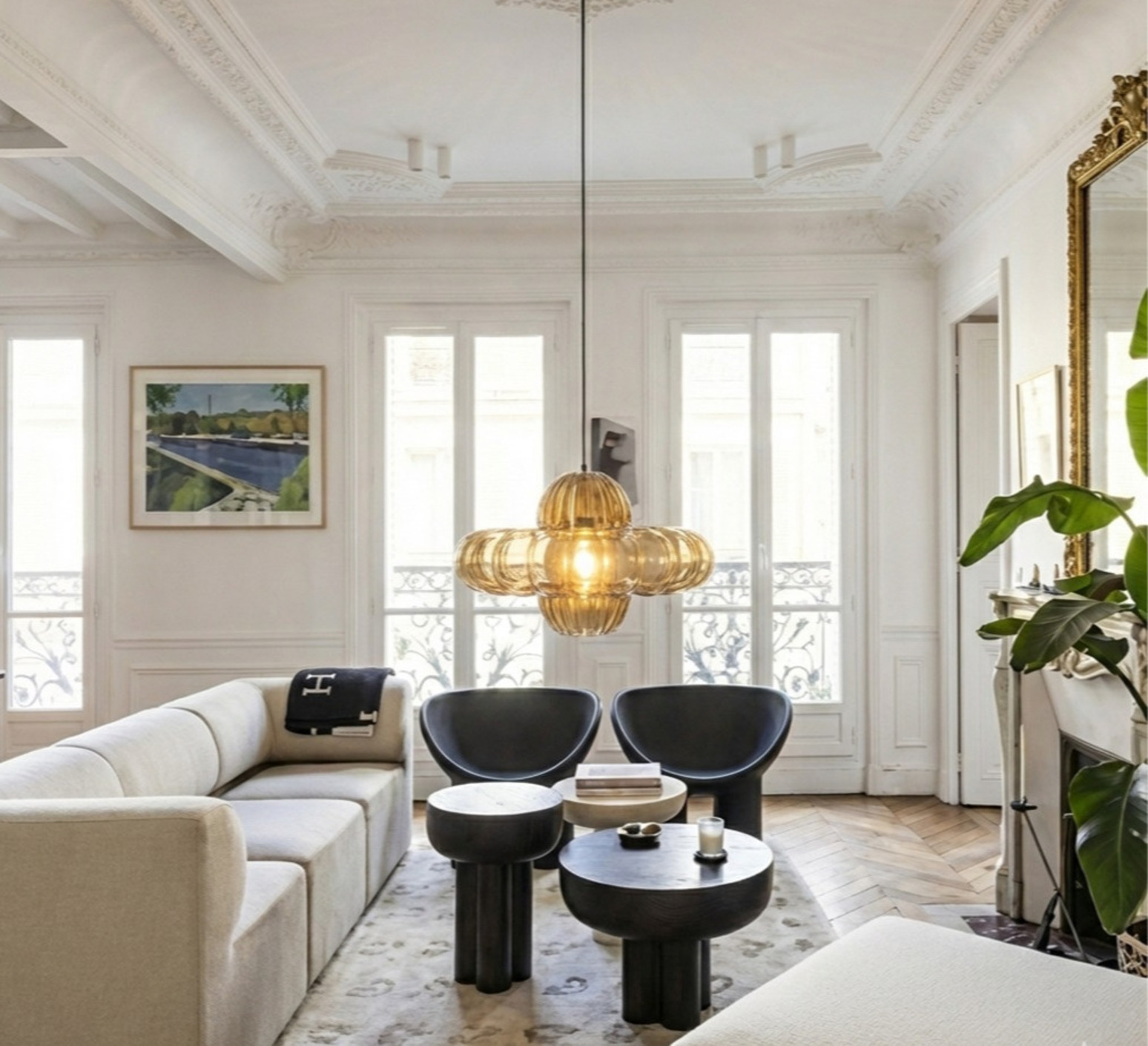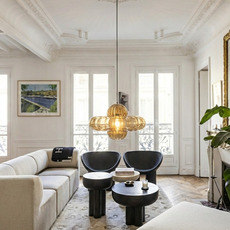 Als Einzelstück über einem Beistelltisch oder als Komposition über einer Insel oder einem Esstisch schafft sie einen luftigen visuellen Rhythmus. Sie lässt sich mit mineralischen Materialien, dunklem Holz oder lackierten Oberflächen kombinieren, um die Kontraste von Licht und Material zu betonen.