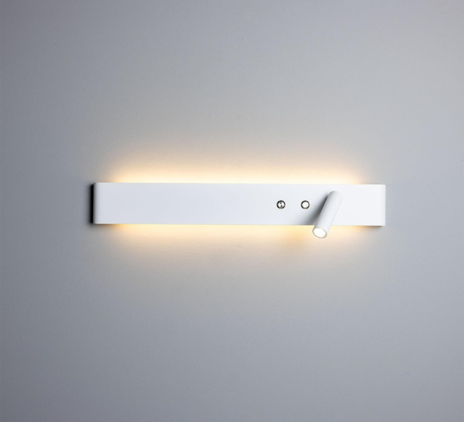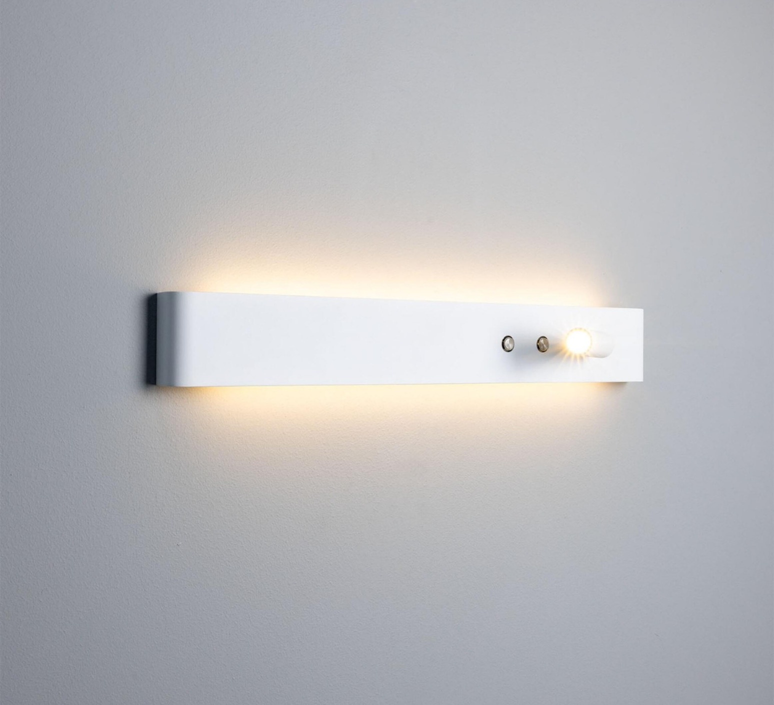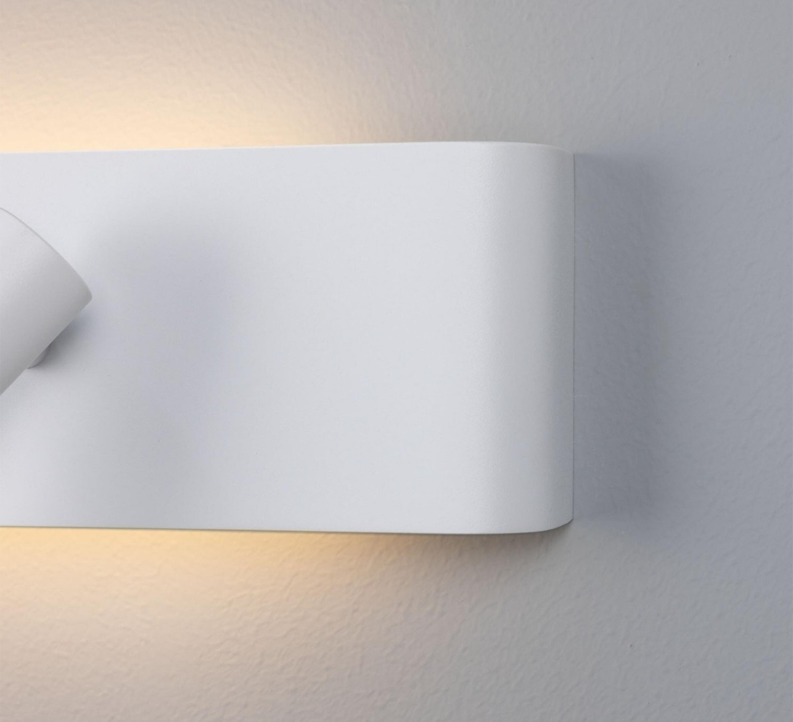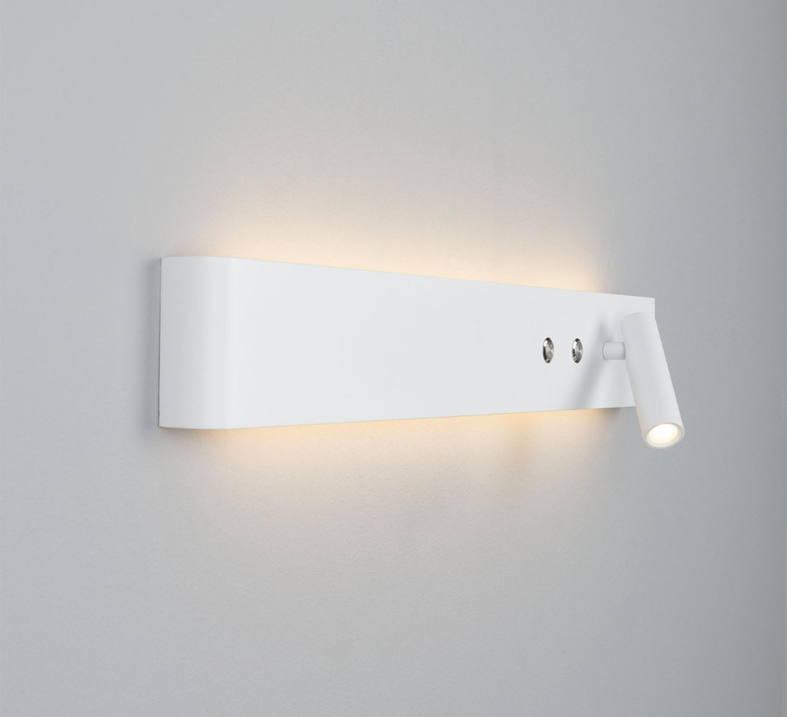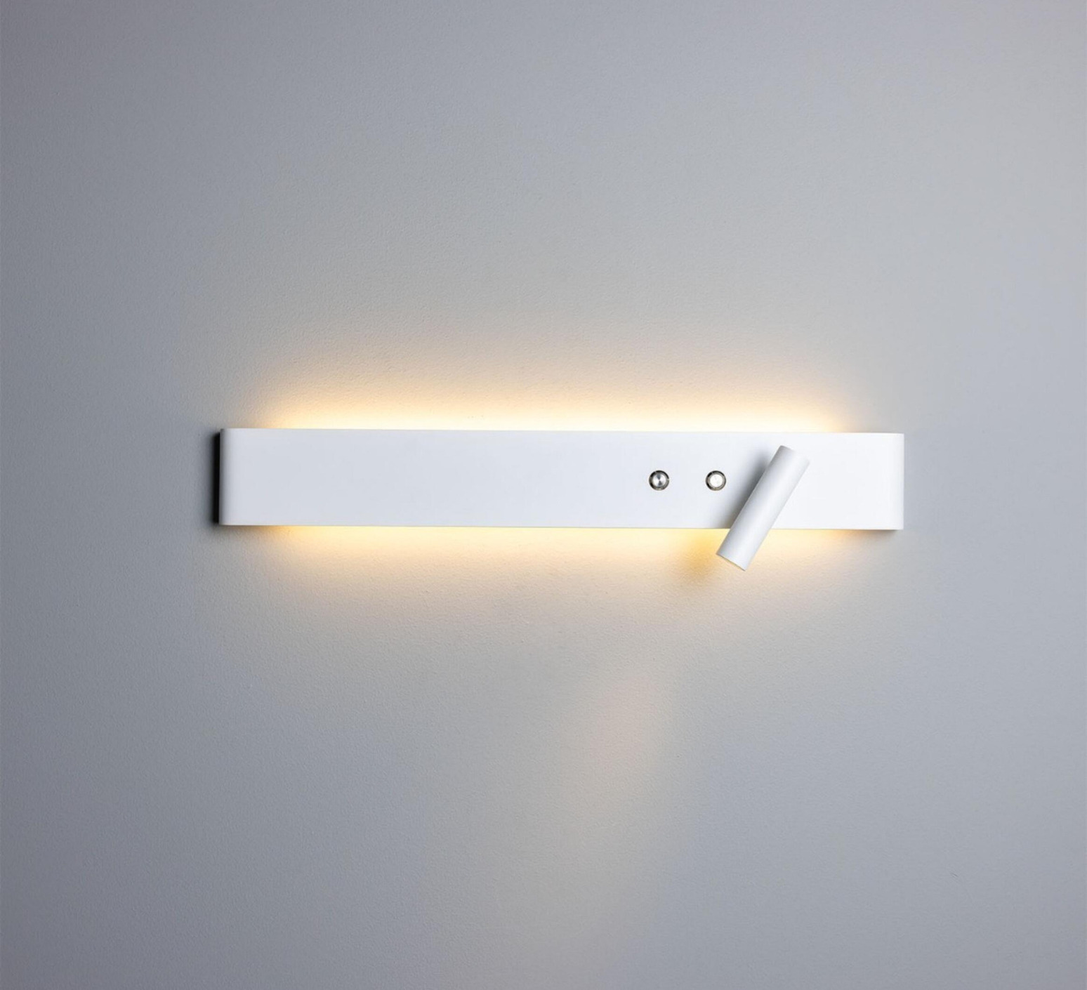 Ihr langgestrecktes Design aus weißem Aluminium schafft eine schlichte Silhouette, die sich leicht in moderne Schlafzimmer oder Hotelbereiche einfügt. Der eingebaute LED-Strahler bietet eine einstellbare gerichtete Beleuchtung, während die Hintergrundbeleuchtung ein weiches Licht an die Wand wirft und so für Komfort und Atmosphäre sorgt. Mit den beiden Druckknöpfen lassen sich die Funktionen je nach Tagesbedarf separat steuern.