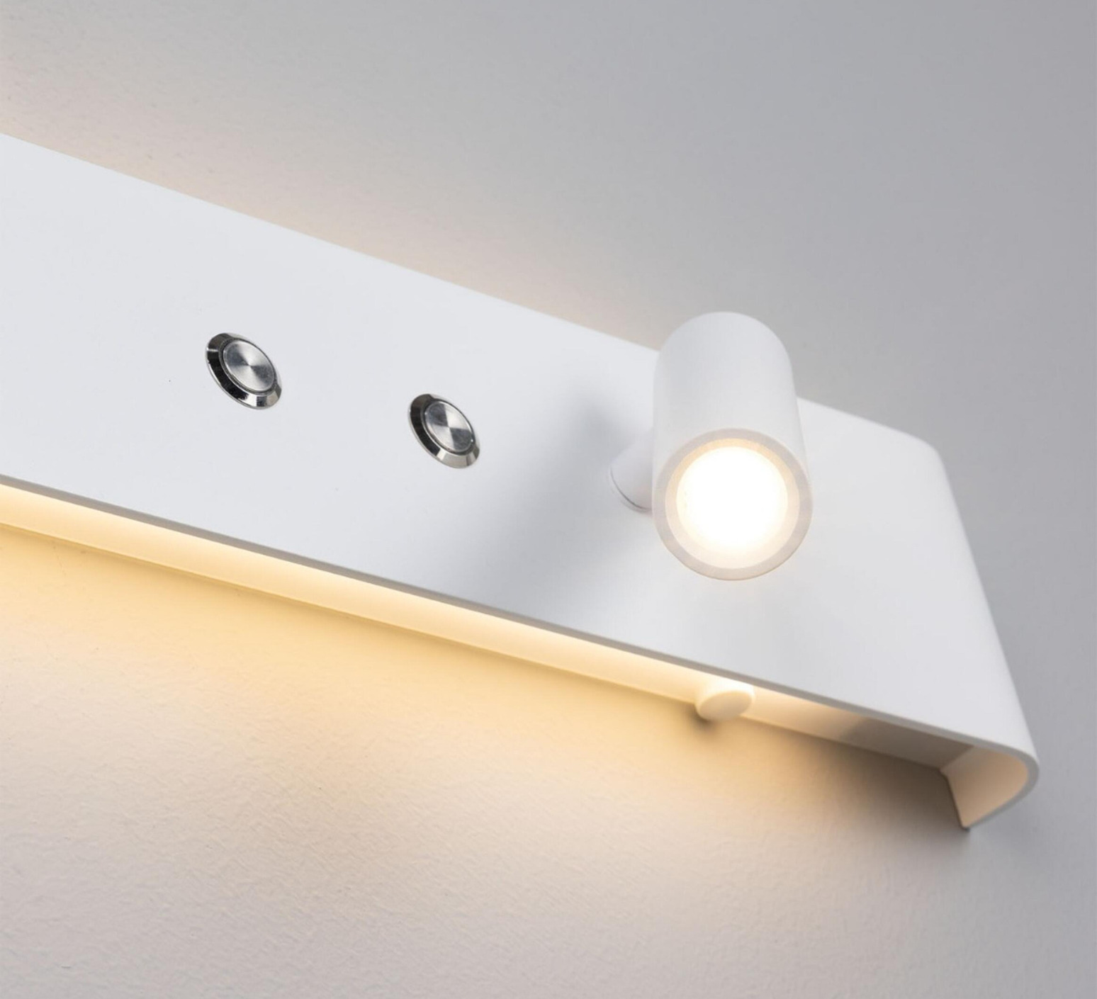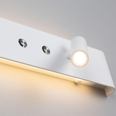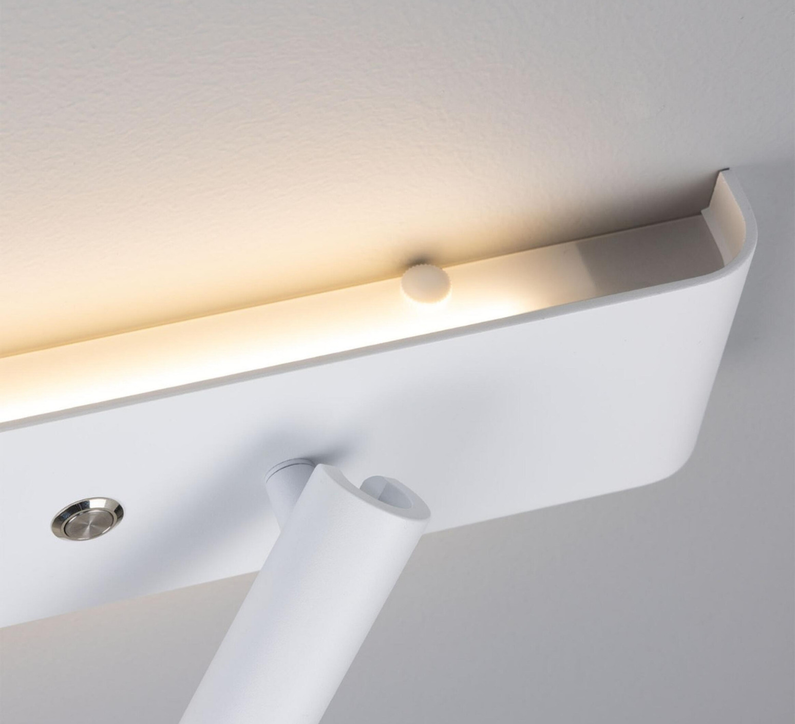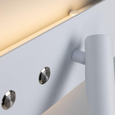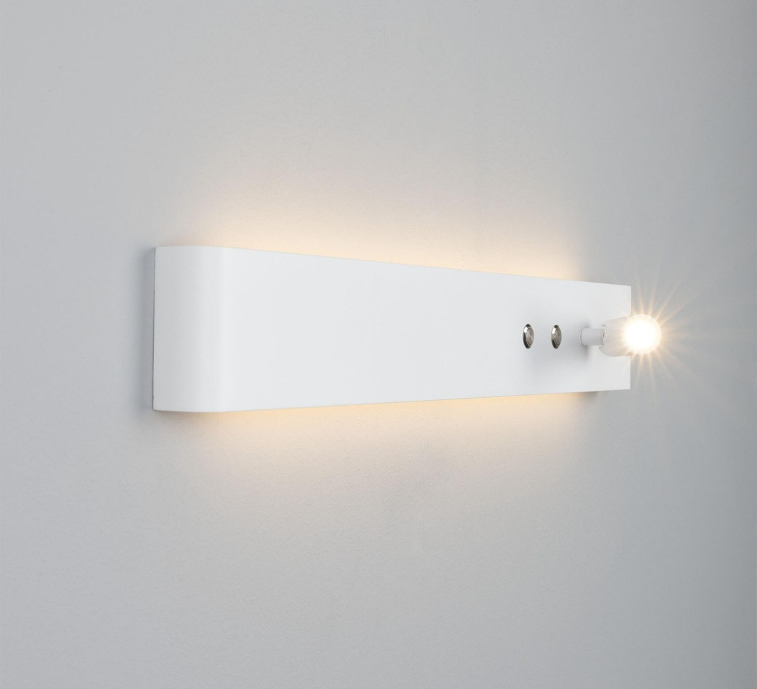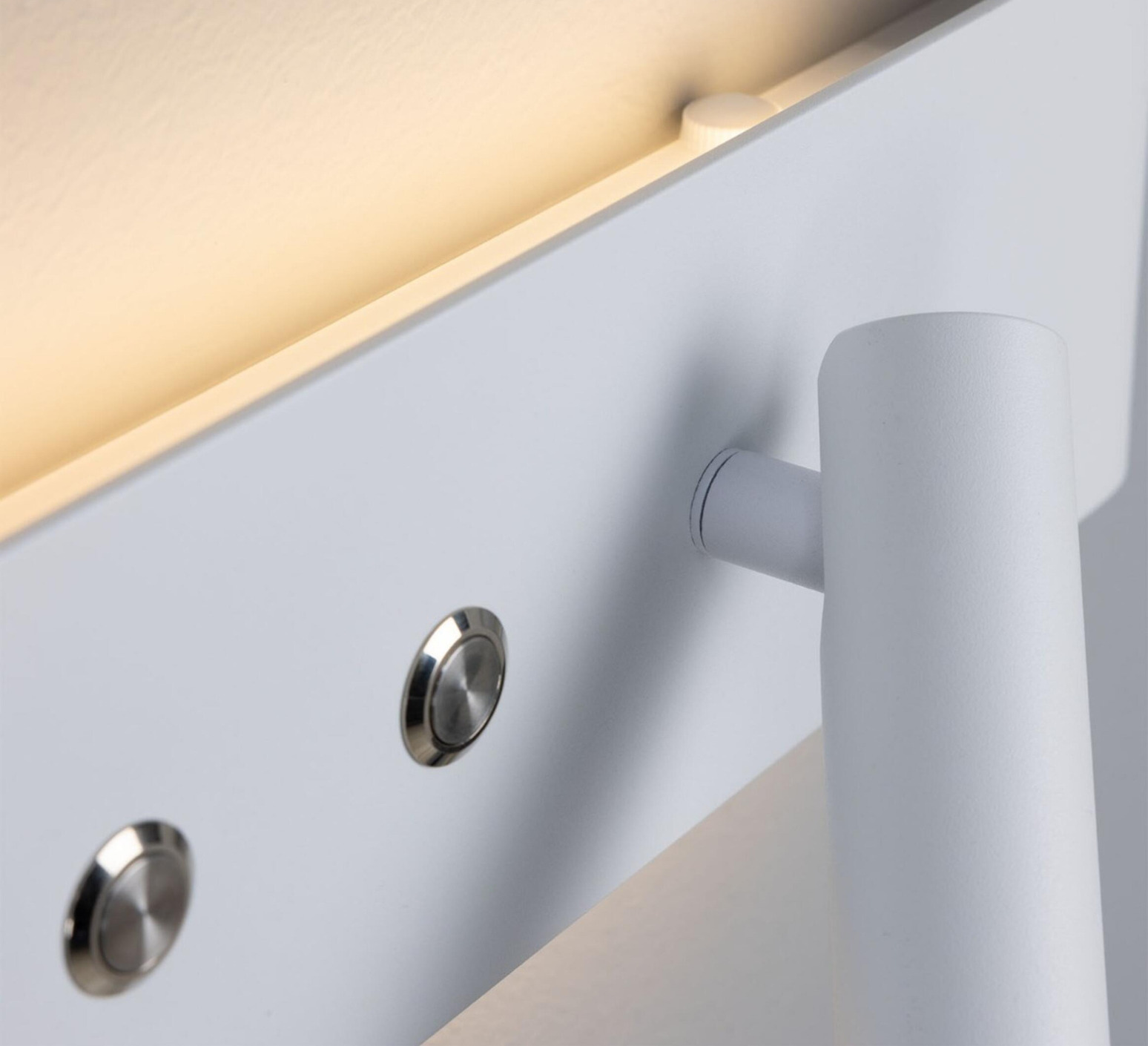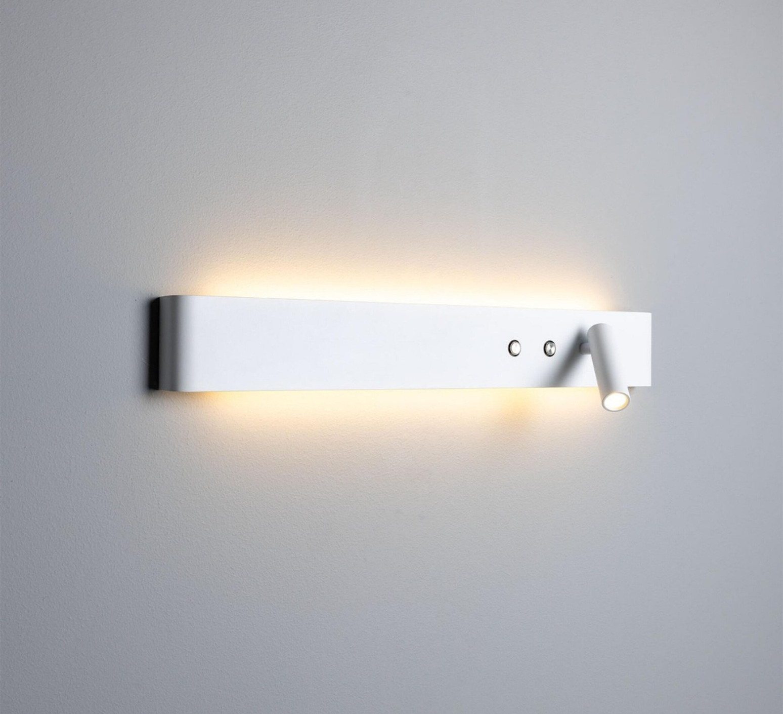 Ihr langgestrecktes Design aus weißem Aluminium schafft eine schlichte Silhouette, die sich leicht in moderne Schlafzimmer oder Hotelbereiche einfügt. Der eingebaute LED-Strahler bietet eine einstellbare gerichtete Beleuchtung, während die Hintergrundbeleuchtung ein weiches Licht an die Wand wirft und so für Komfort und Atmosphäre sorgt. Mit den beiden Druckknöpfen lassen sich die Funktionen je nach Tagesbedarf separat steuern.