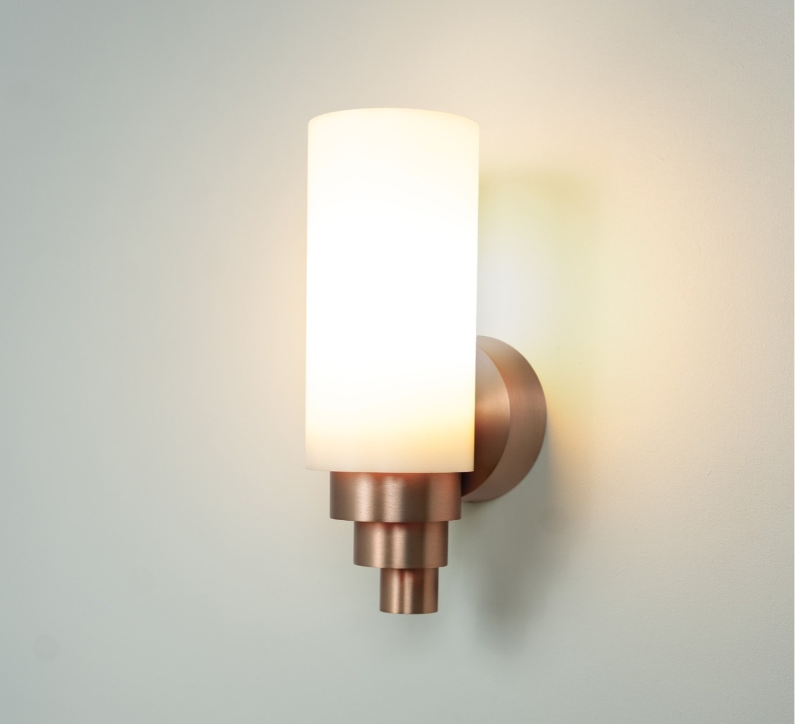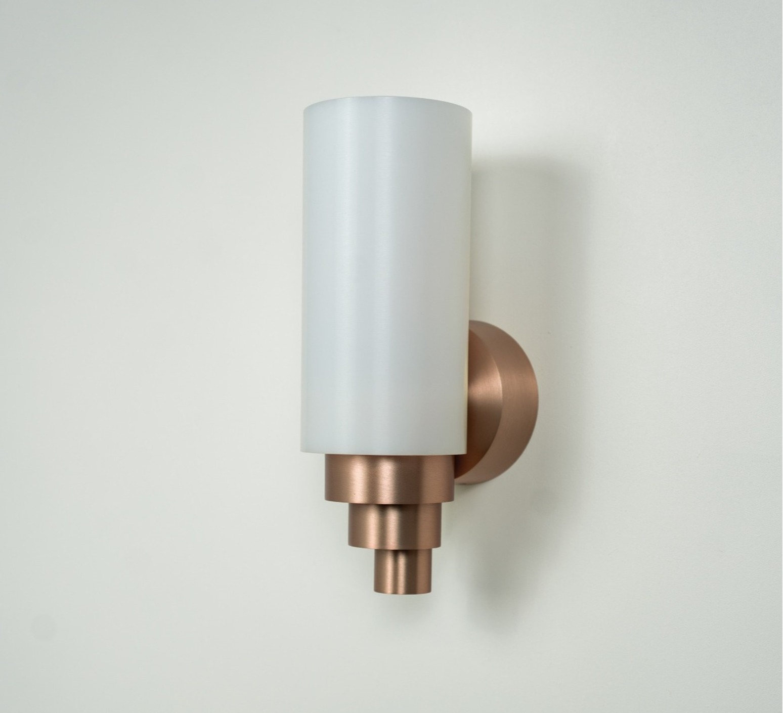 Ihr Design beruht auf einer minimalistischen Architektursprache, bei der das Ineinandergreifen von Messingrohren mit sorgfältig durchdachten Proportionen einen strukturierten und eleganten Rhythmus von Volumen bildet. Der zylindrische Diffusor aus opalem Polycarbonat macht das Licht weicher und bewahrt gleichzeitig eine diskrete grafische Präsenz. Ob am Kopfende eines Bettes, in einem Eingangsbereich oder in einer Reihe in einem Korridor, Scala führt eine raffinierte Vertikalität und ein subtiles Schattenspiel ein. Dekorative Anekdote: Seine satinierte Kupferoberfläche passt besonders gut zu natürlichen Materialien wie Leinen oder heller Eiche und verstärkt die sanfte Lichtstreuung.