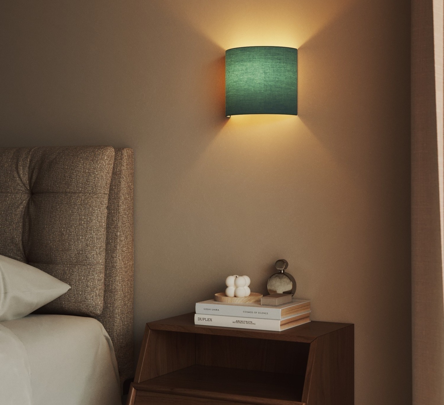 Der halbzylindrische Lampenschirm aus grünem Dubbio-Stoff, der auf eine leichte Struktur gespannt ist, verbreitet ein weiches und warmes Licht, das ideal ist, um eine intime Atmosphäre in einem Wohnzimmer, einem Schlafzimmer oder einem Flur zu schaffen. Sein Farbton passt perfekt zu modernen oder natürlichen Inneneinrichtungen und verleiht einen Hauch von Sanftheit und Harmonie. Die Wandleuchte Ventola, die einzeln oder als Paar installiert werden kann, besticht durch ihr schlichtes Aussehen und ihre Fähigkeit, Räume zu veredeln, ohne sie zu beschweren.