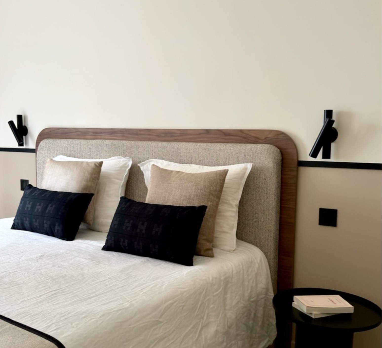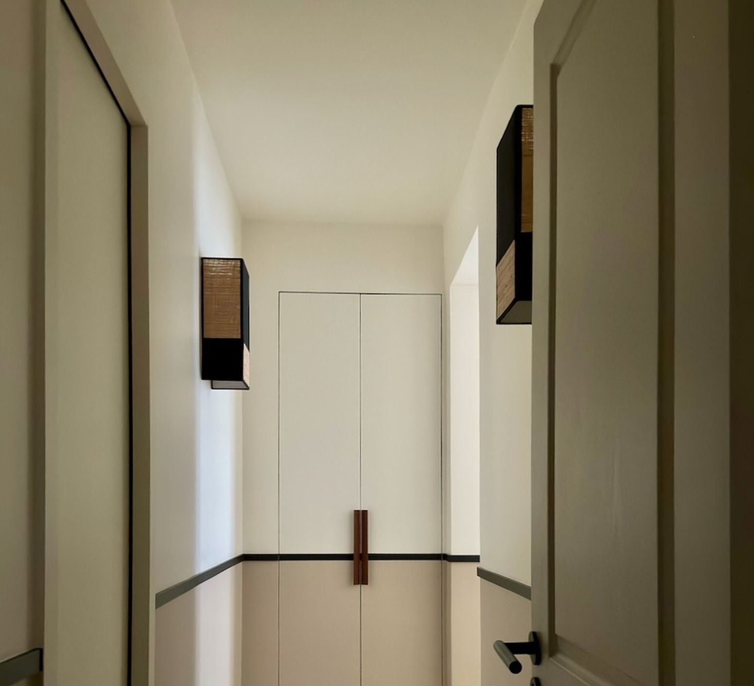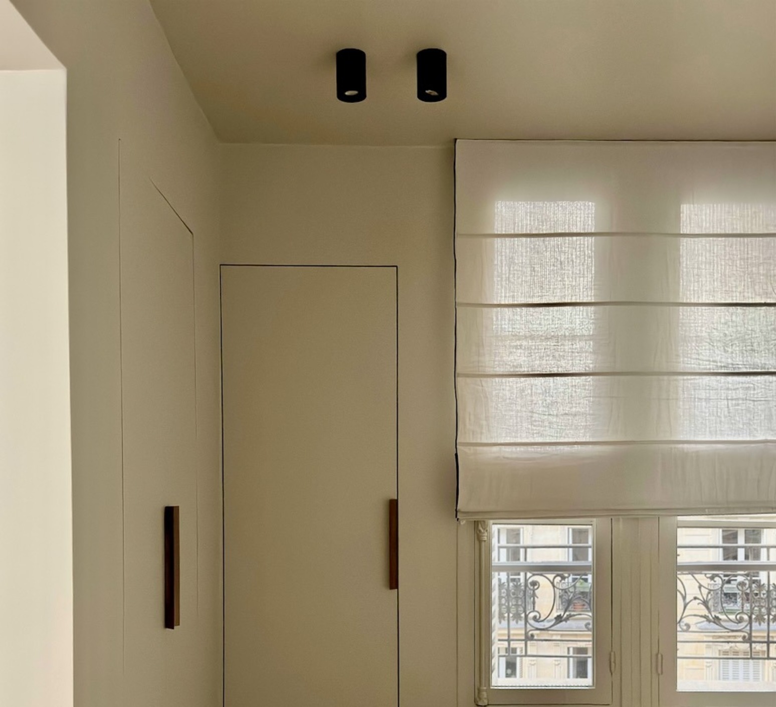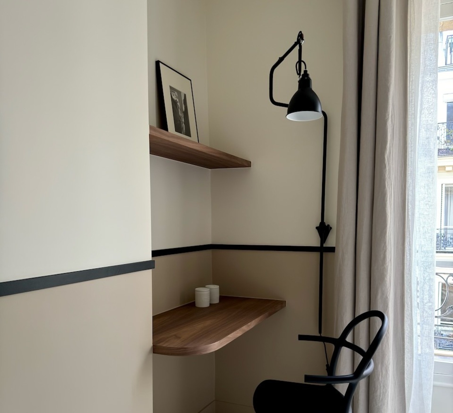 In the heart of the 9ᵉ arrondissement, this 130 sq.m. family apartment has been completely redesigned into a welcoming, cohesive interior. A palette of warm beiges, a masterful interplay of lines and delicate contrasts of dark wood and black subtly punctuate the ensemble.
