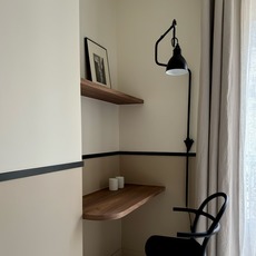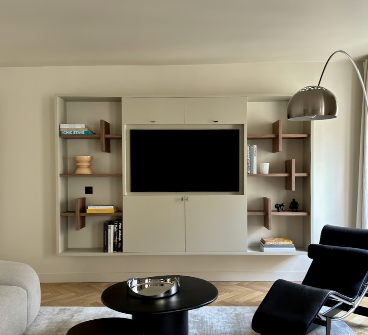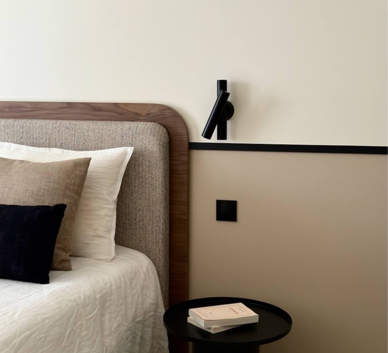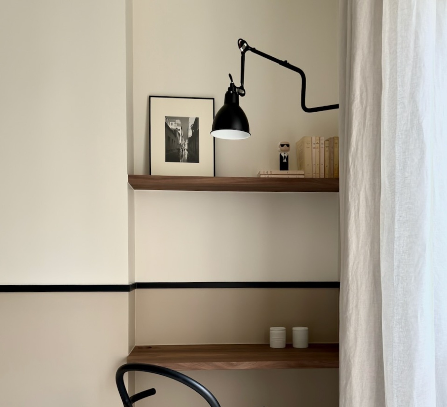 In the heart of the 9ᵉ arrondissement, this 130 sq.m. family apartment has been completely redesigned into a welcoming, cohesive interior. A palette of warm beiges, a masterful interplay of lines and delicate contrasts of dark wood and black subtly punctuate the ensemble.
