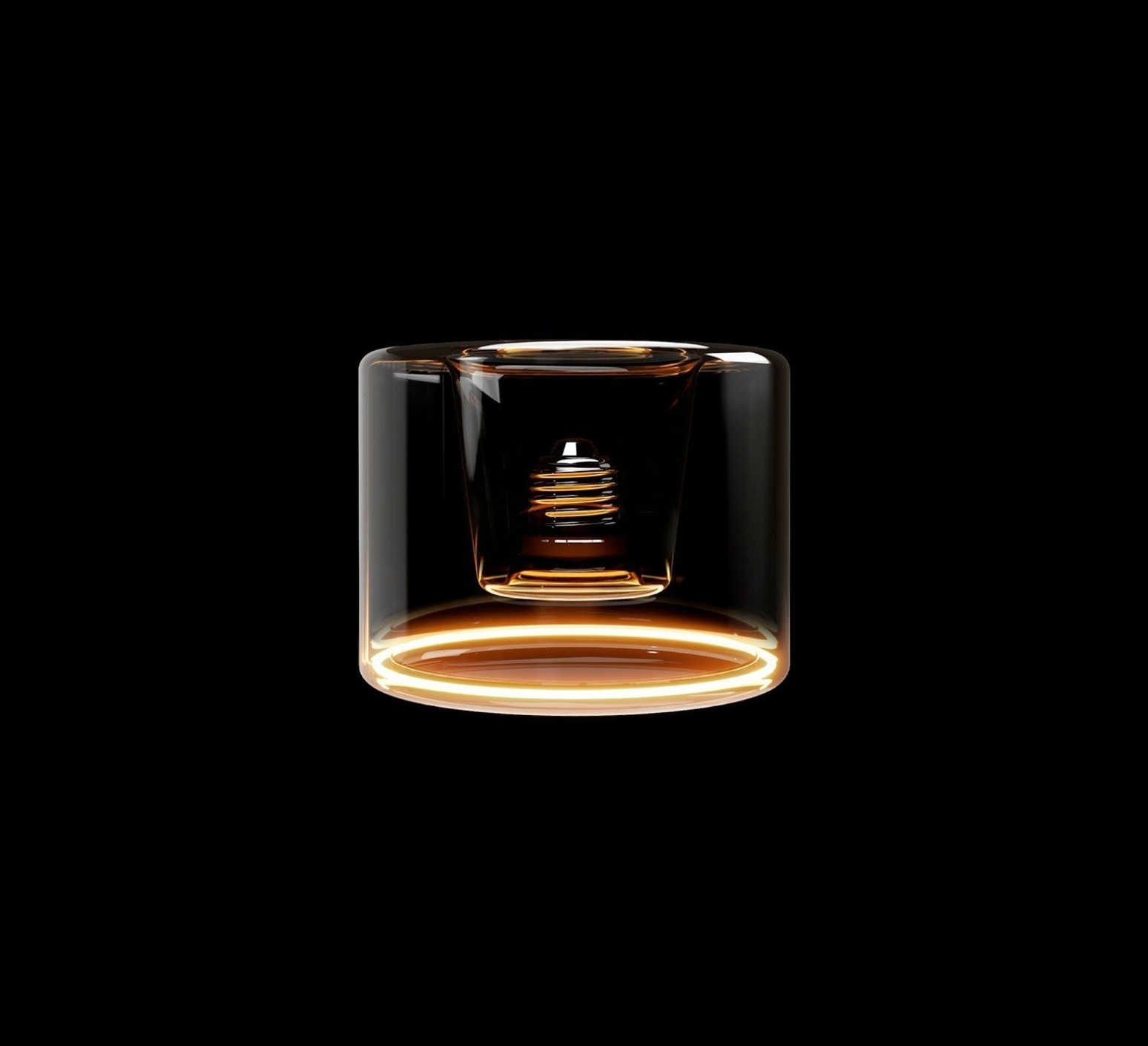 With its inverted ring shape in smoked glass, it diffuses a soft, ethereal halo, while offering a striking visual impact. Its warm 1900 K light output (equivalent to a candle flame) envelops spaces in an intimate, elegant atmosphere.