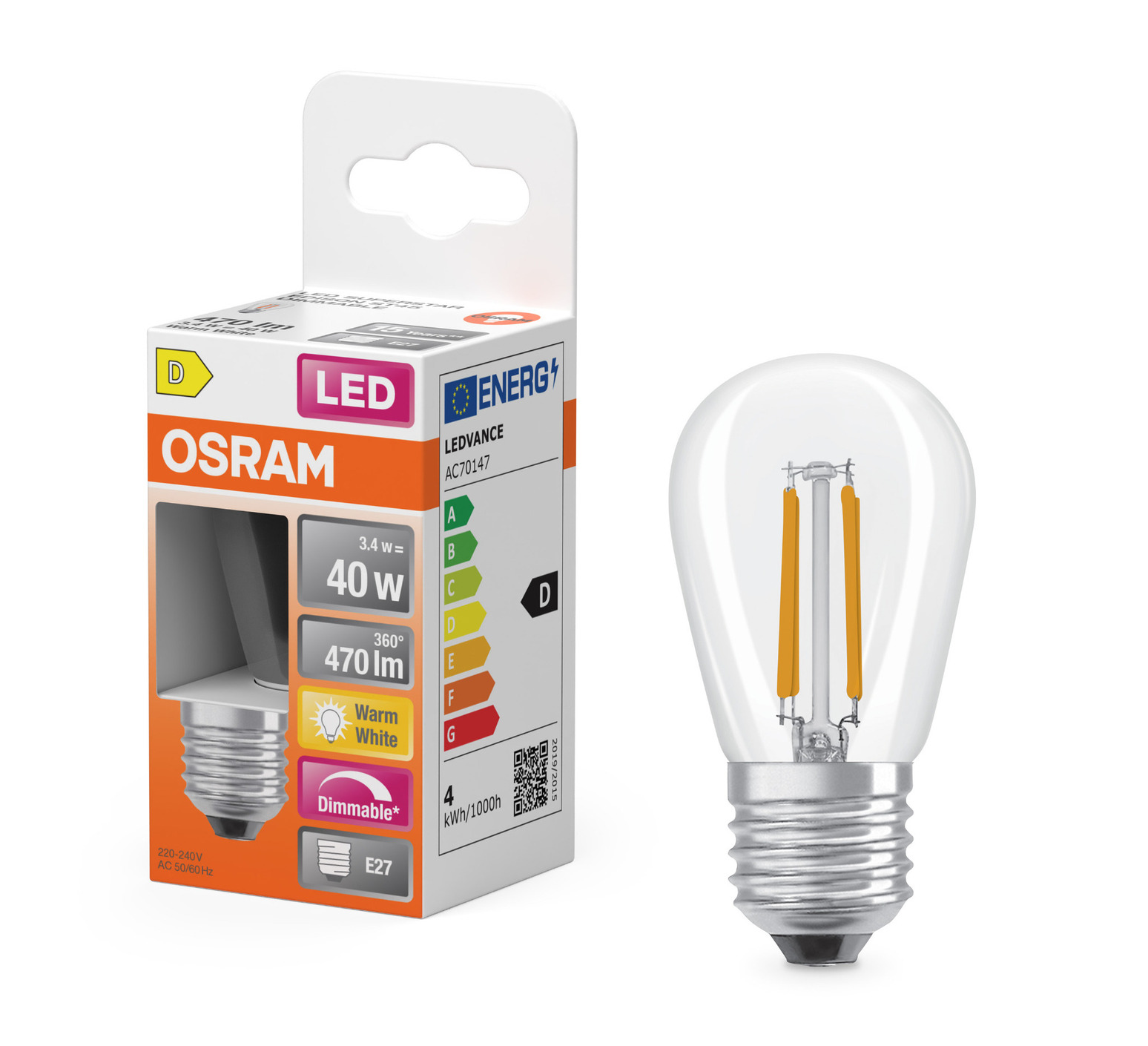 LED bulb, E27, Mini Edison ST45, clear, dim, 3,4W, 2700K, 470 lm, Ø4,5cm, H8,8cm - Osram