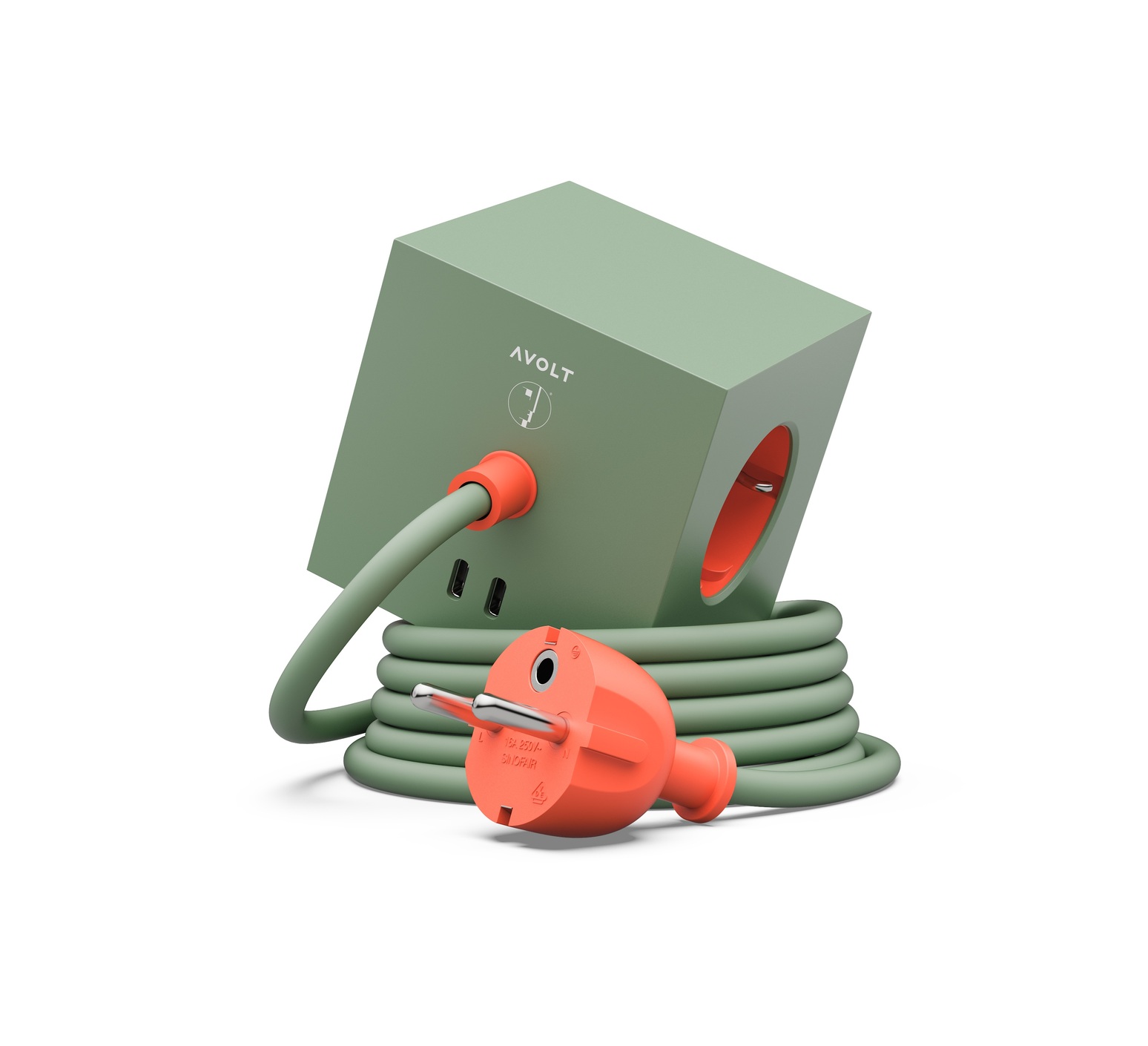 Socket, Square 1 x Bauhaus-Arhiv, Single 1,8m, Gecko bloom, Schuko-Socket x3, USB-Socket C x2, L7,6cm, H7,6cm - Avolt
