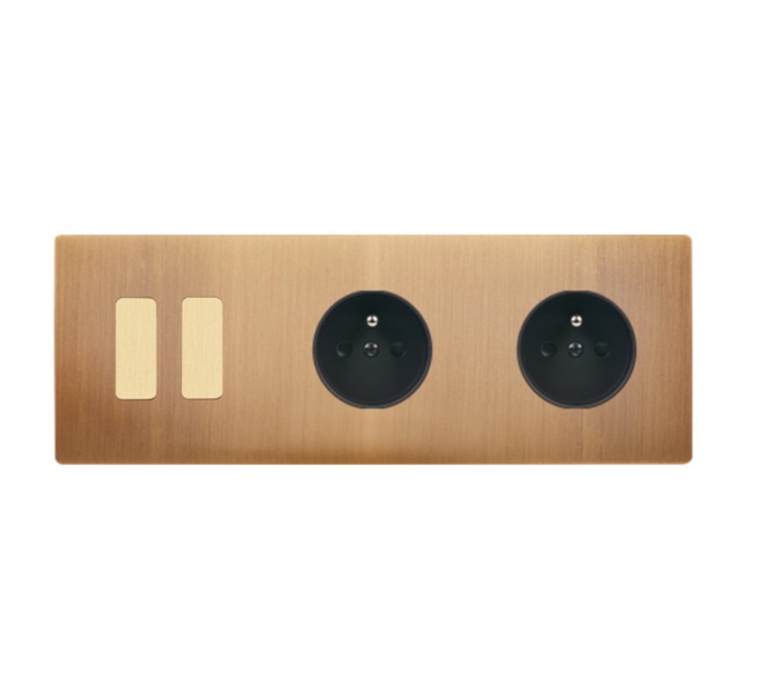 Switch and Socket, M, Triple horizontal, Old bronze, Va-et-vient or pushbutton x2, Socket-2P+T x2, Brushed brass, W22,2cm, H8cm - Modelec