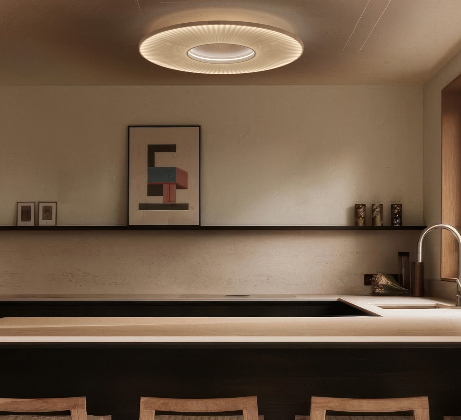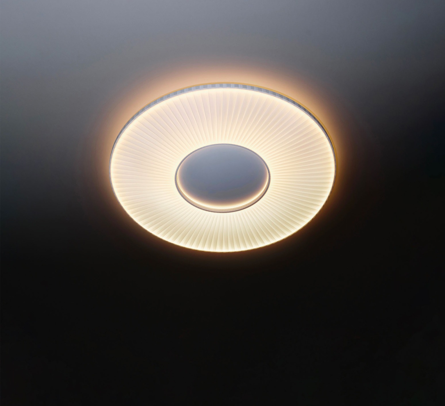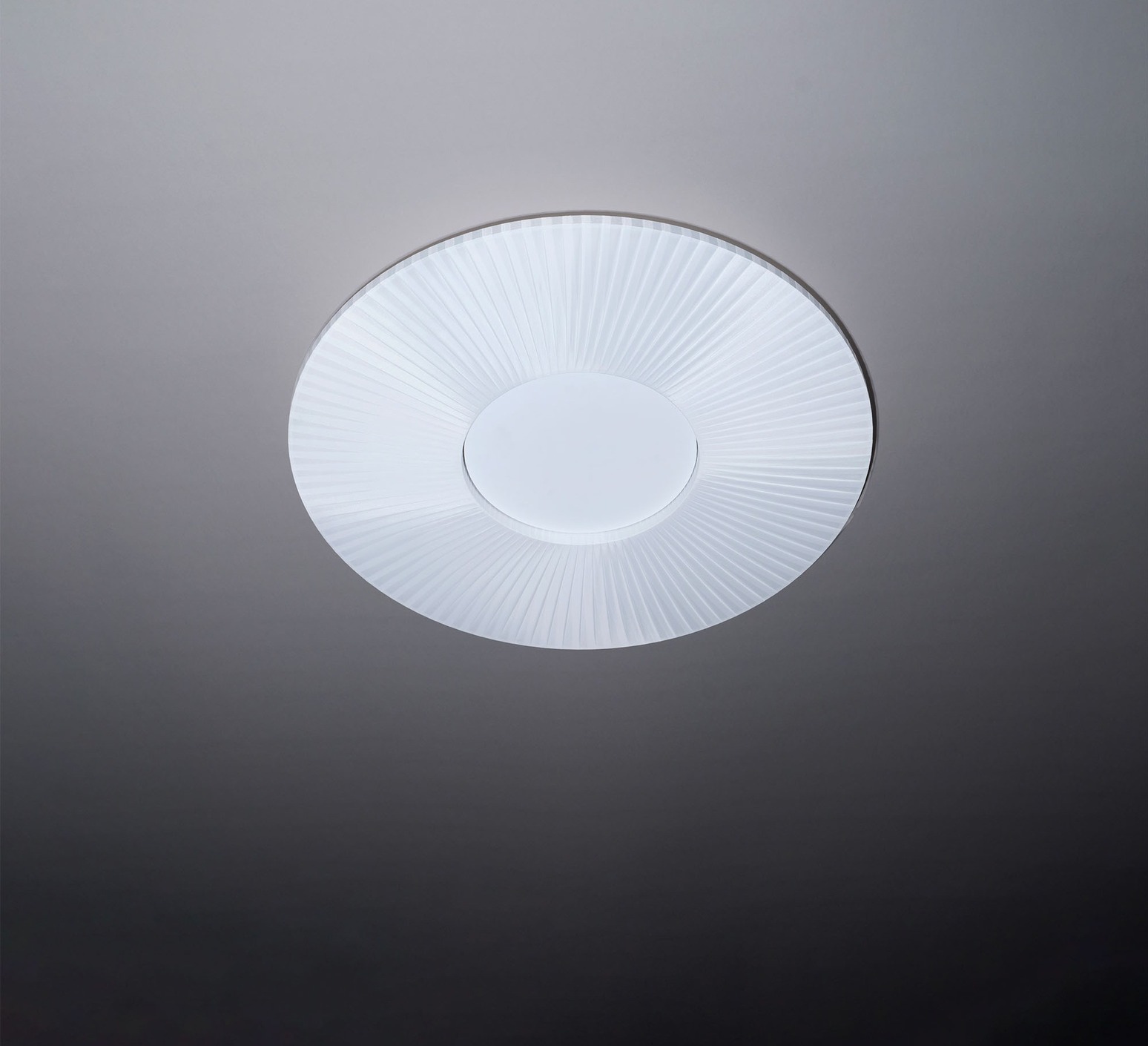 Iris is a veritable interior sun. Its powerful yet soft and diffused light evokes that of a star. Composed of a white ribbon shade and a discreet structure, it seems to float on the ceiling, illuminating the space with lightness and elegance.