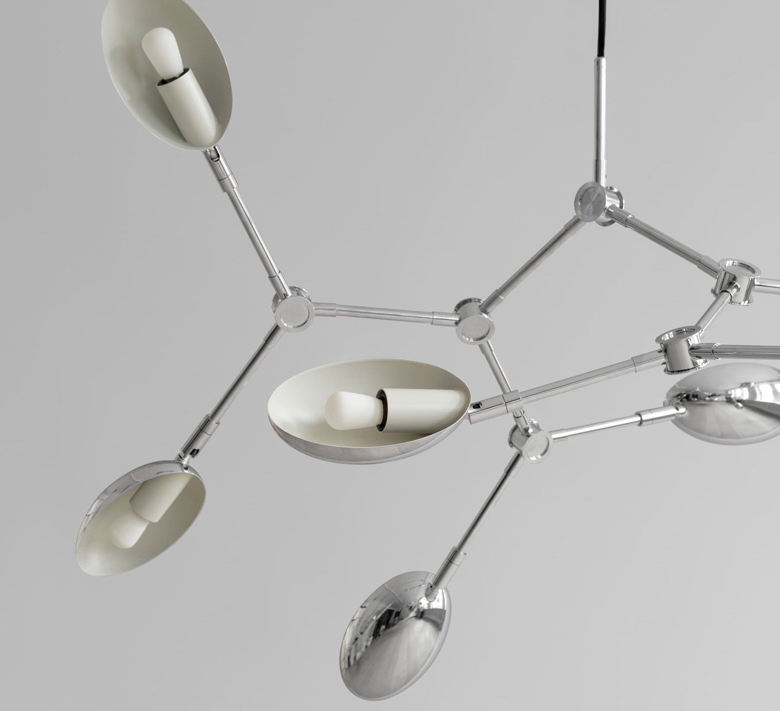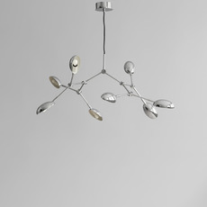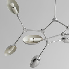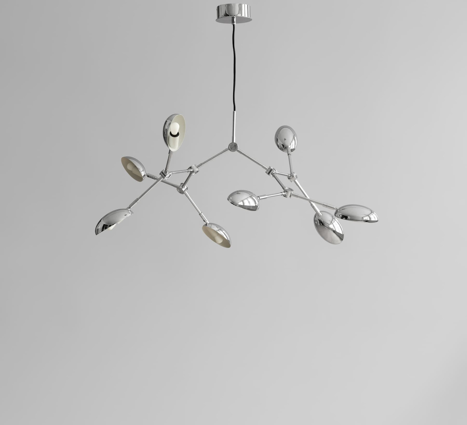 Its chrome aluminum structure features 14 flexible, adjustable arms topped by gently curved shades, creating a dynamic interplay of light and shadow. The shimmering chrome finish subtly reflects the environment and enhances the room's focal point. Drop Mini can be hung over a table in a living room or high-ceilinged hallway, alone or in combination with other fixtures, to give rhythm and structure to the space.