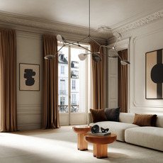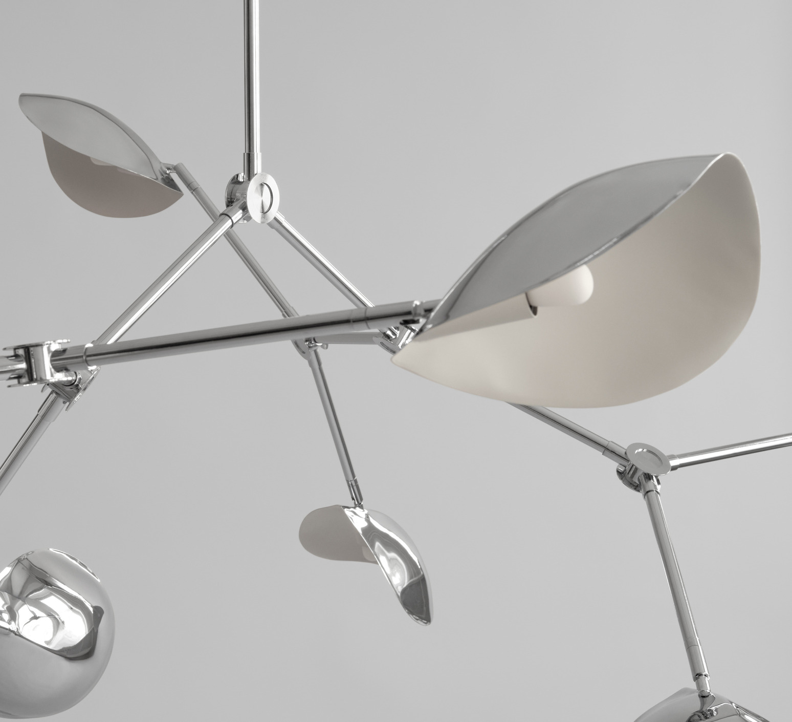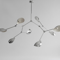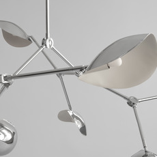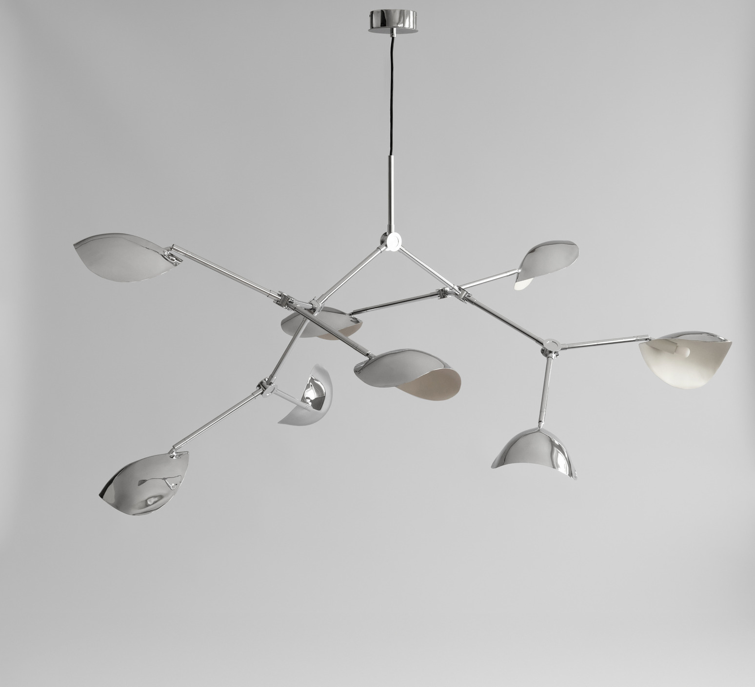 Its chrome aluminum structure features a sculptural shade with soft curves and striking lines, projecting changing shadows and reflections depending on the angle of view. Stingray Grande can be hung over a table in a living room or high-ceilinged hallway, alone or in combination with other fixtures, to create a dynamic visual effect and structure the space.