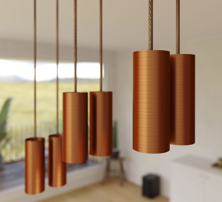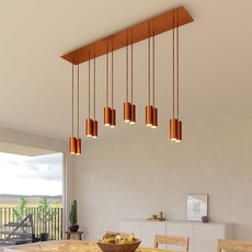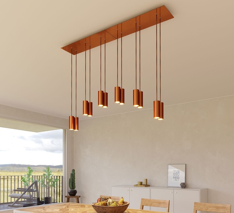 Comprising six tubular hangers in satin-finish copper metal, this chandelier stands out for its graphic silhouette and harmonious lines. The beautifully finished rectangular Rose-One canopy visually structures the space and ensures even lighting. Perfect above a large table, kitchen island or reception area, it diffuses direct, targeted light, while adding a touch of architectural elegance. For a spectacular effect, two Tub-E14 chandeliers can be placed side by side to create a 12-light composition (as in our ambience photo), ideal for large volumes or high-end furnishing projects.