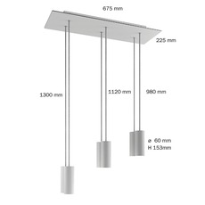 This luminaire includes a rectangular Rose-One horn (67.5 x 22.5 cm), six E14 sockets (max. 10W each) and 1.30 m, 1.12 m and 0.98 m glossy optical white textile cables for a rhythmic visual effect. Compatible with LED PAR16, R50 Satin or any E14 bulb Ø < 50 mm (not included), it offers direct lighting, dimmable according to installation and bulb chosen. The Rose-One surface-mounting rose is included, and its modular system enables several luminaires to be linked together to create unique lighting compositions.