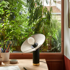 This bi-material table lamp enhances your interior with a blend of materials such as metal, brass details and retro brick-arched fabric.