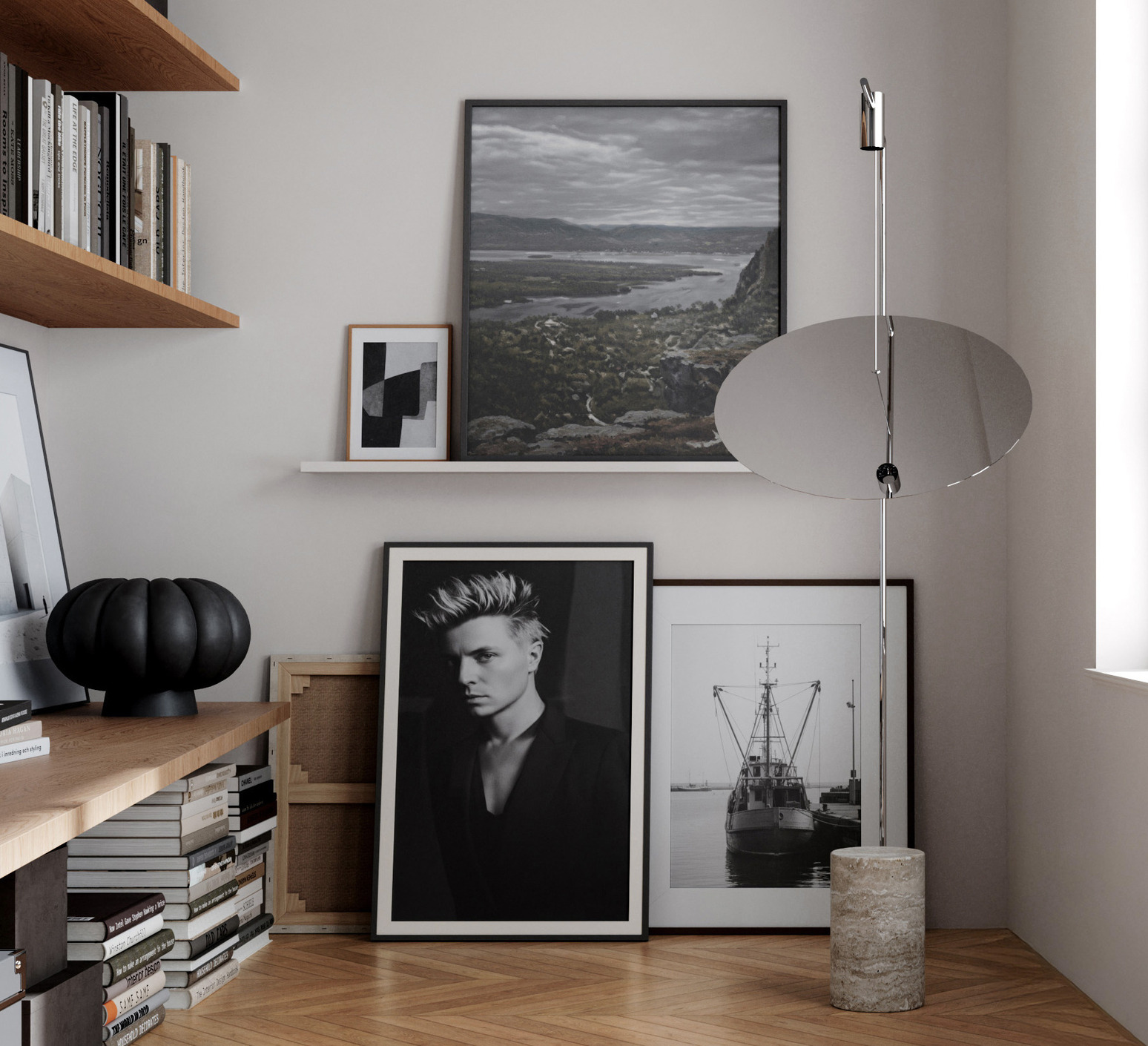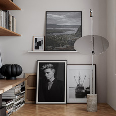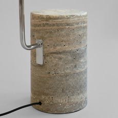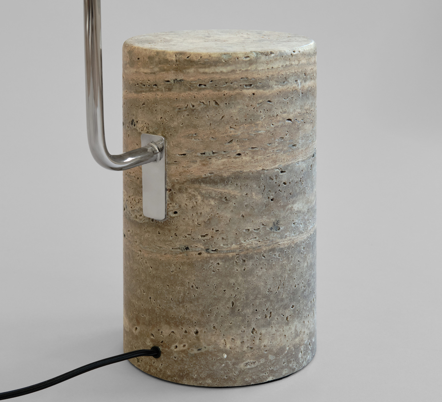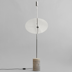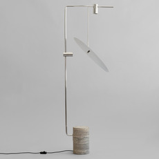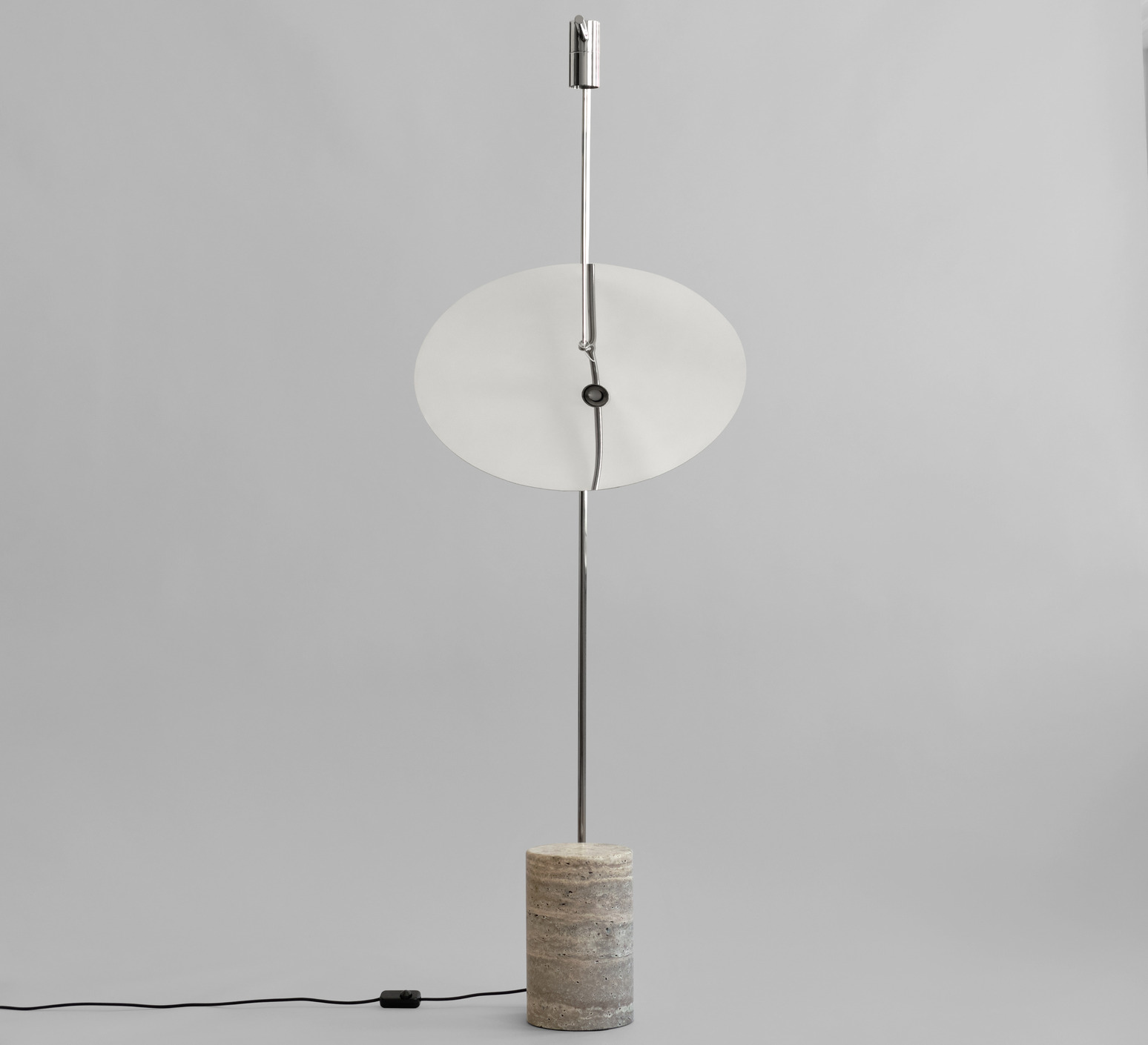 Its circular design combines a polished chrome arm with an oversized shade and a silver travertine base, reflecting and diffusing light indirectly. Two light sources arranged along the arm create a soft glow that transforms a reading corner or living room into a space of serenity and depth. The Moon can be placed as a central or accompanying element in a lighting composition to visually enrich the interior.