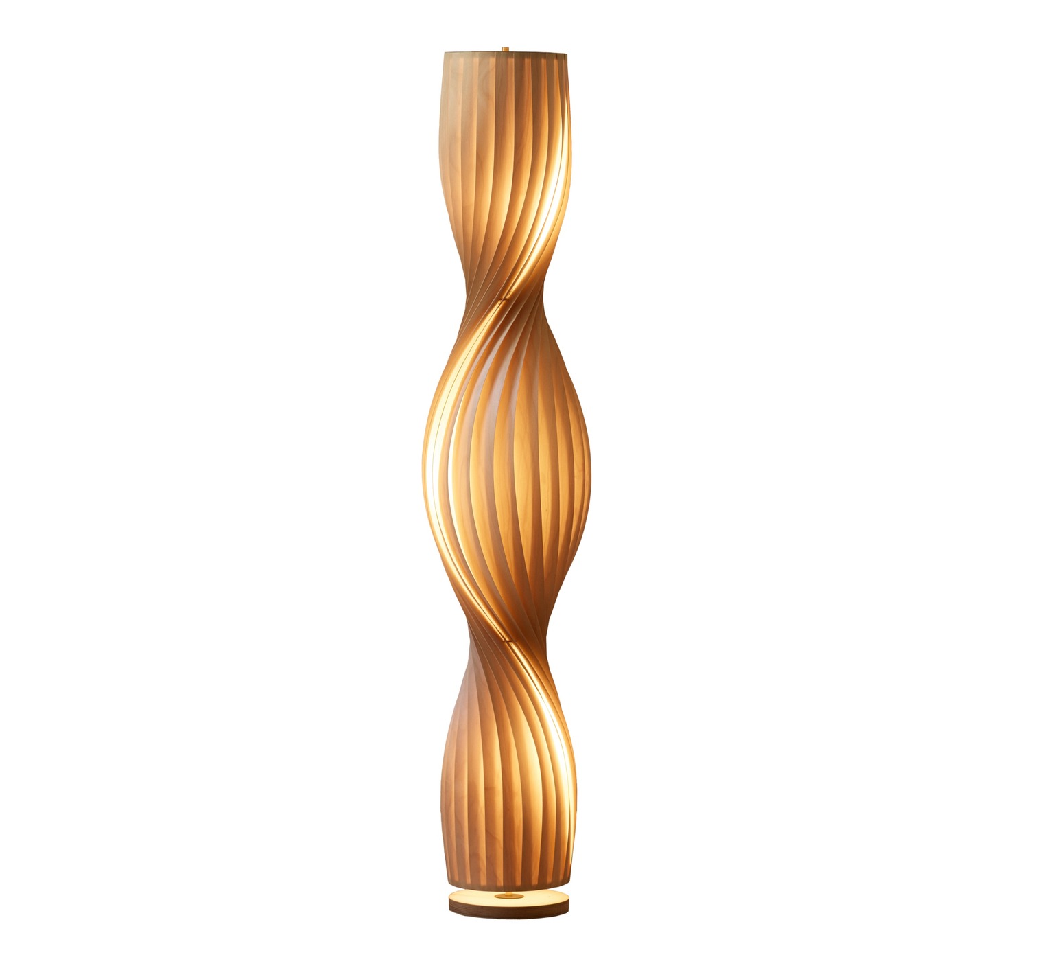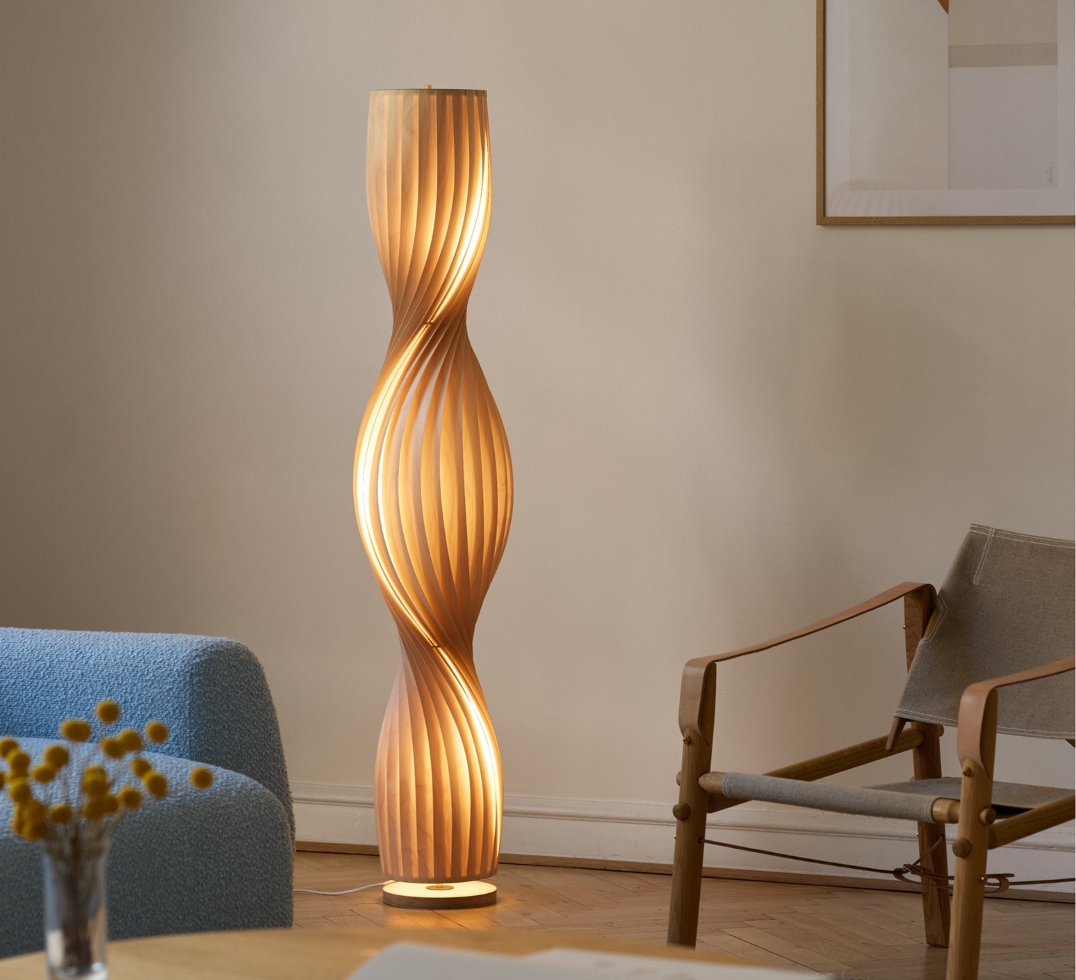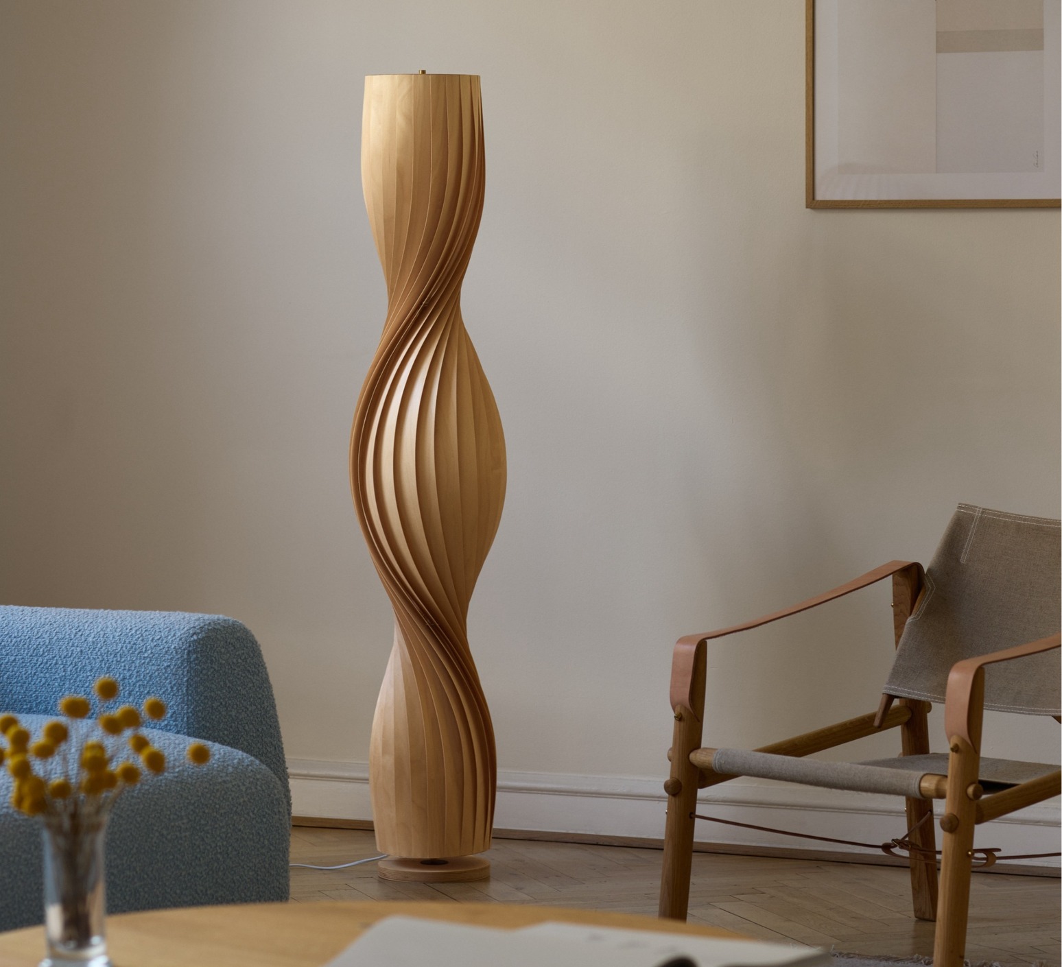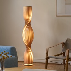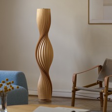 Made from natural birch, the TR4 floor lamp adopts a sculptural cylindrical silhouette composed of thin, twisted slats. This organic structure filters light and creates a warm play of shadows, inspired by the evolution of the original model designed twenty years ago. Placed in a living room, reading corner or near an armchair, it provides a strong visual presence while diffusing a soft, enveloping atmosphere, in harmony with natural materials and uncluttered interiors.