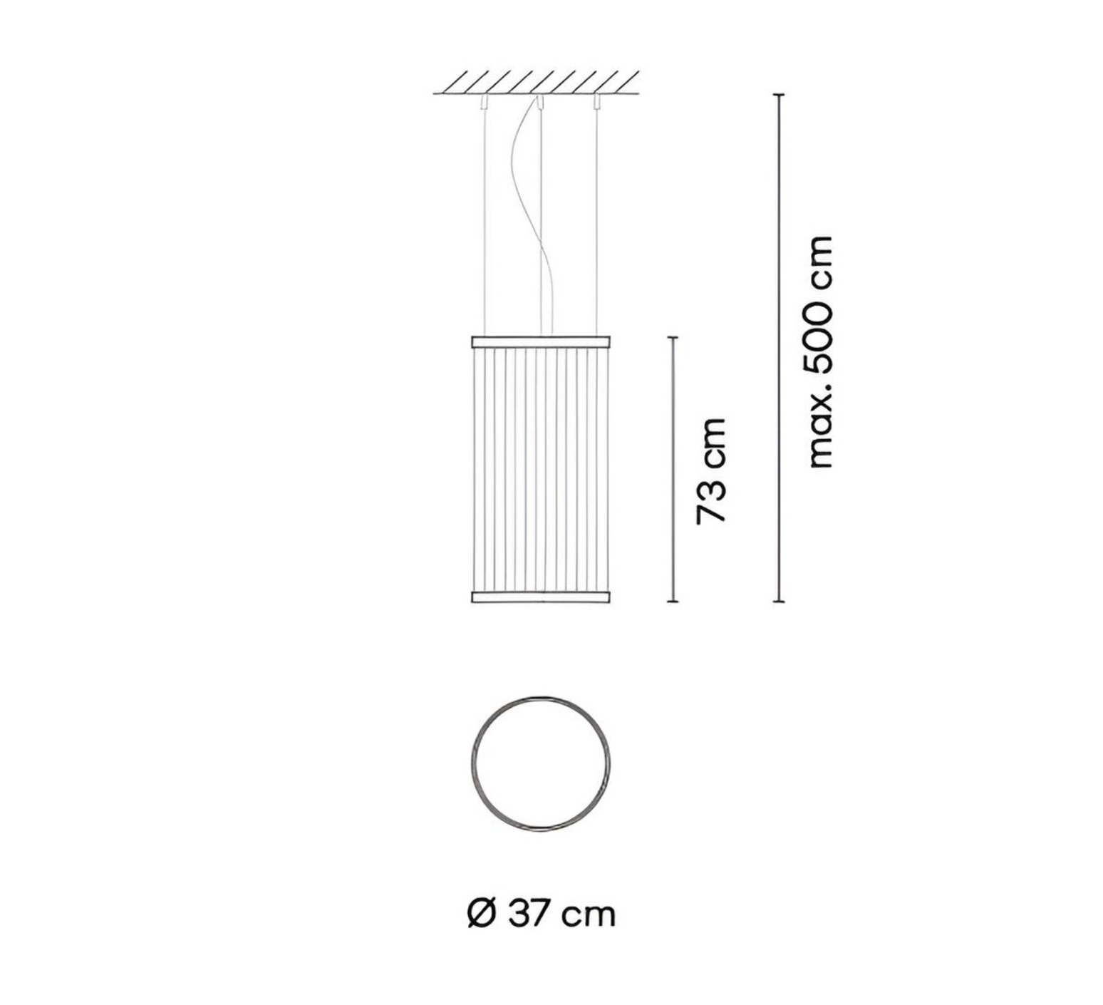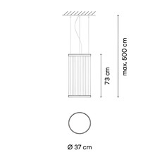 The luminaire measures 37cm in diameter and 73cm in height. The LED strip is integrated with a maximum power of 22W, a color temperature of 2700K and a luminous intensity of 2662lm. Dimmable in Dali-2. Rosette included on surface.