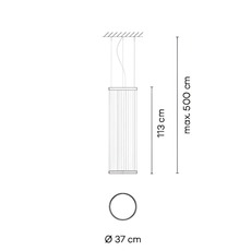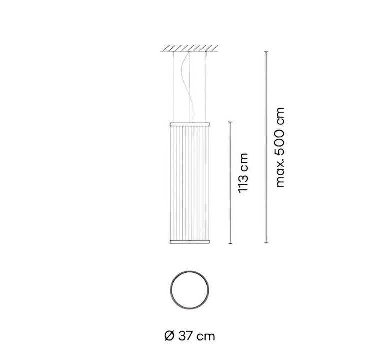 The luminaire measures 37cm in diameter and 113cm in height. The LED strip is integrated with a maximum power of 22W, a color temperature of 2700K and a luminous intensity of 2662lm. Dimmable push-button/dali-2.