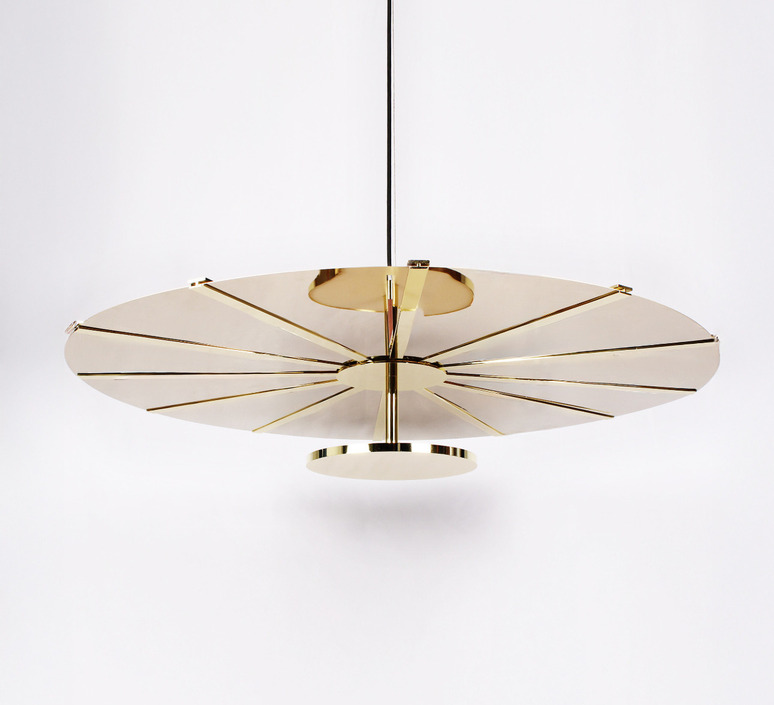 Crafted in gilded metal, the Madia suspension is composed of blades whose geometric rigor captures and modulates light. Ideal for creating a soft, structured atmosphere above a dining table, island or reception area. Its large 90 cm diameter and slim 1 cm profile emphasize its airy presence without weighing down the composition.