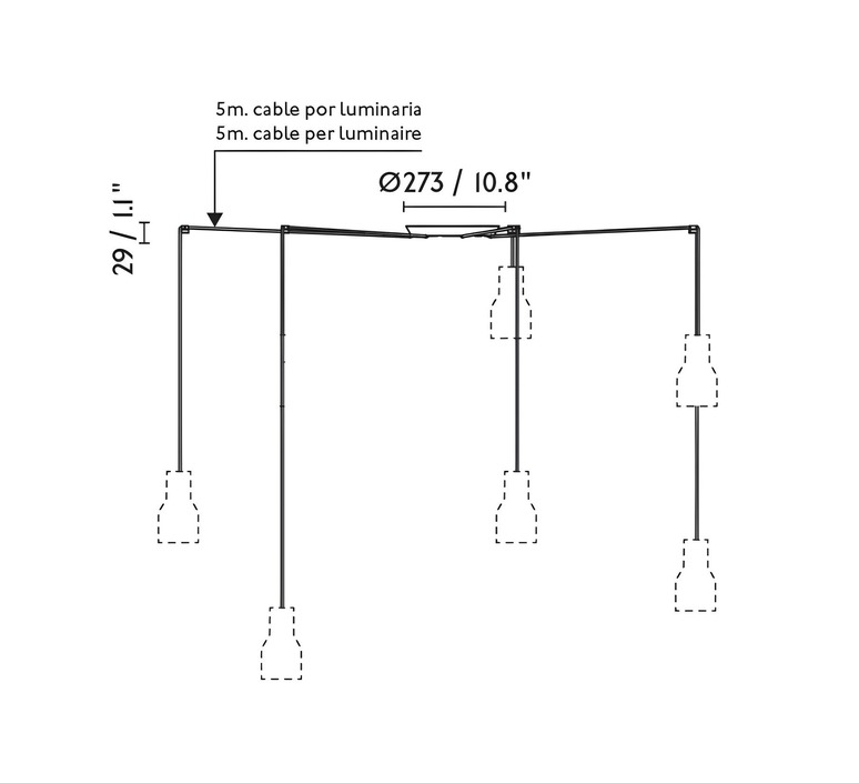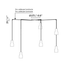 Each shade measures 18.5 cm in height and 11.5 cm in diameter, and is connected to a 5 m long cable. Light sources are not included with this luminaire. You'll need 5 E14 bulbs with a maximum wattage of 5W.