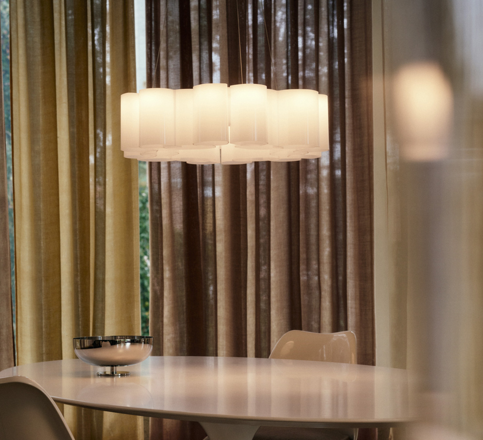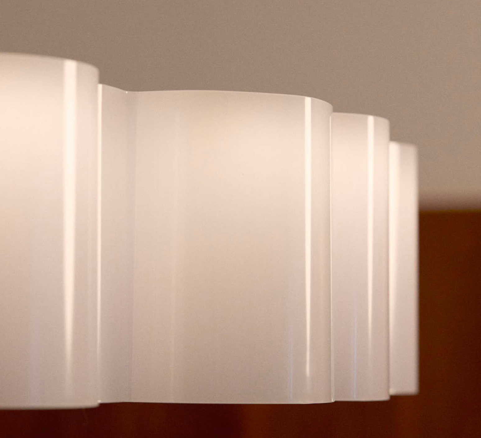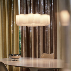 The Honey collection plays on the repetition of a modular element, creating fascinating linear or circular configurations. Modules in injection-molded, high-gloss white polycarbonate form a harmonious structure. Warm light is diffused both directly and indirectly, creating a soft, warm glow in the room. Wavy opals filter the light, adding fascinating nuances to the ambience.