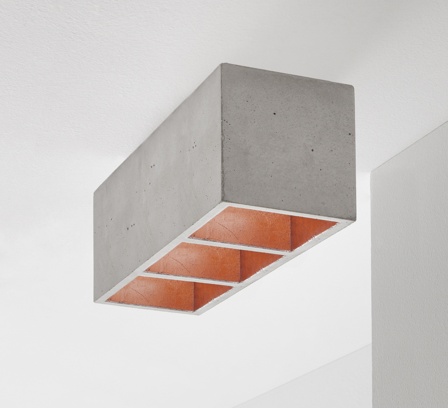 Its cubic design in grey concrete is subtly enhanced by a copper interior, creating a warm, elegant contrast. The raw look of concrete combined with copper highlights gives the [B7]³ spotlight a contemporary, natural presence. It blends harmoniously into a living room, hallway or kitchen, as a stand-alone installation for a decorative accent or in series to visually structure the space.