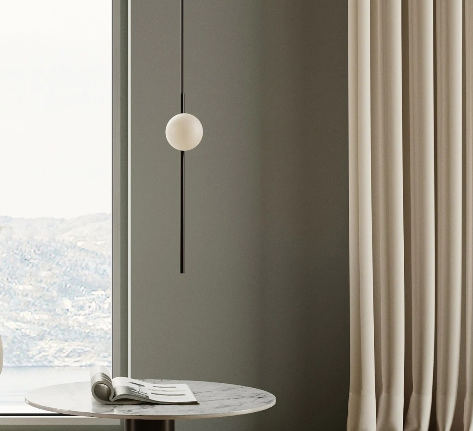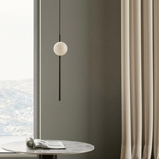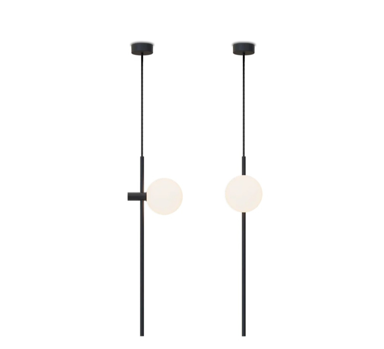 Its sleek design features a glass globe surrounded by a graphic silhouette, revealing a subtle interplay between fluid lines and controlled volumes. Inspired by dance and movement, Roxanne Mono seems to float in space, like a suspended, weightless form diffusing soft light. Its minimalist yet expressive presence makes it a fixture that immediately adds character without weighing down the space.