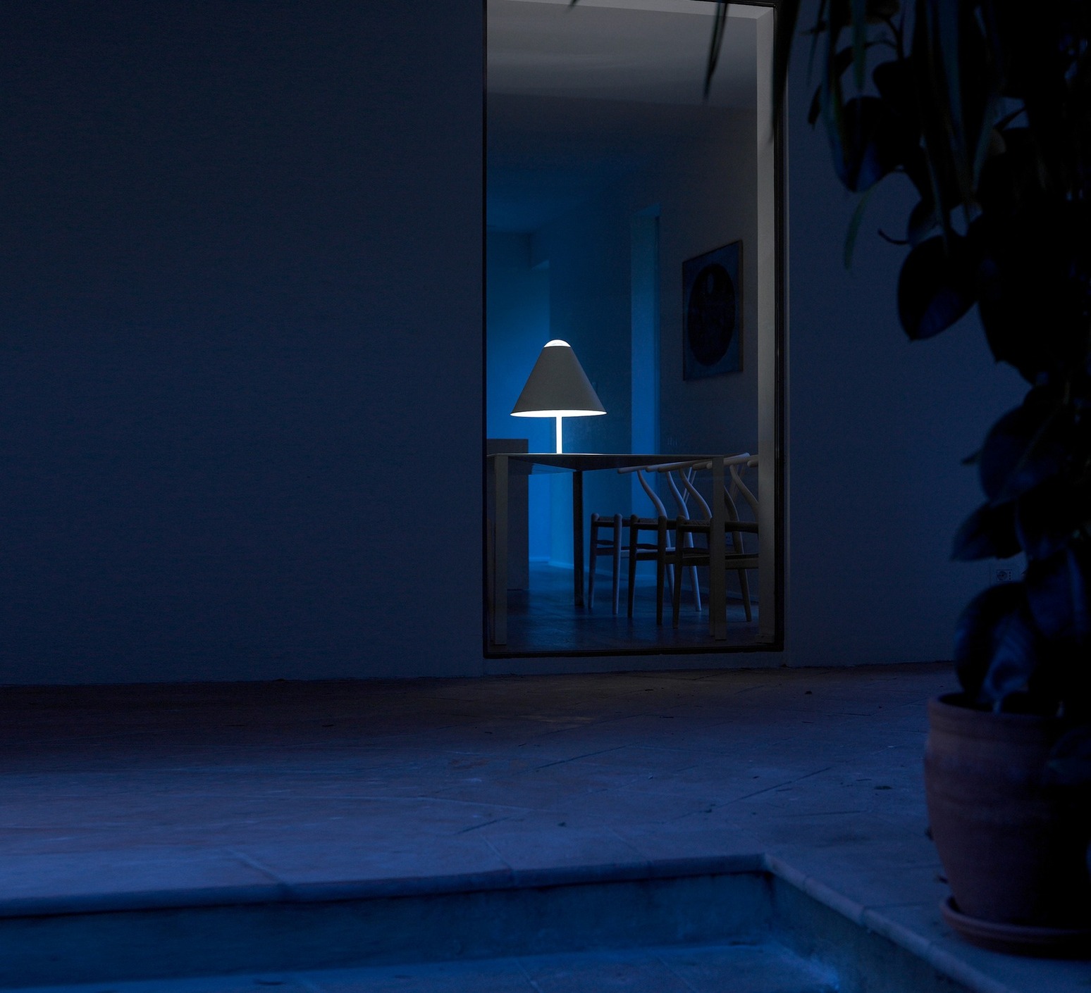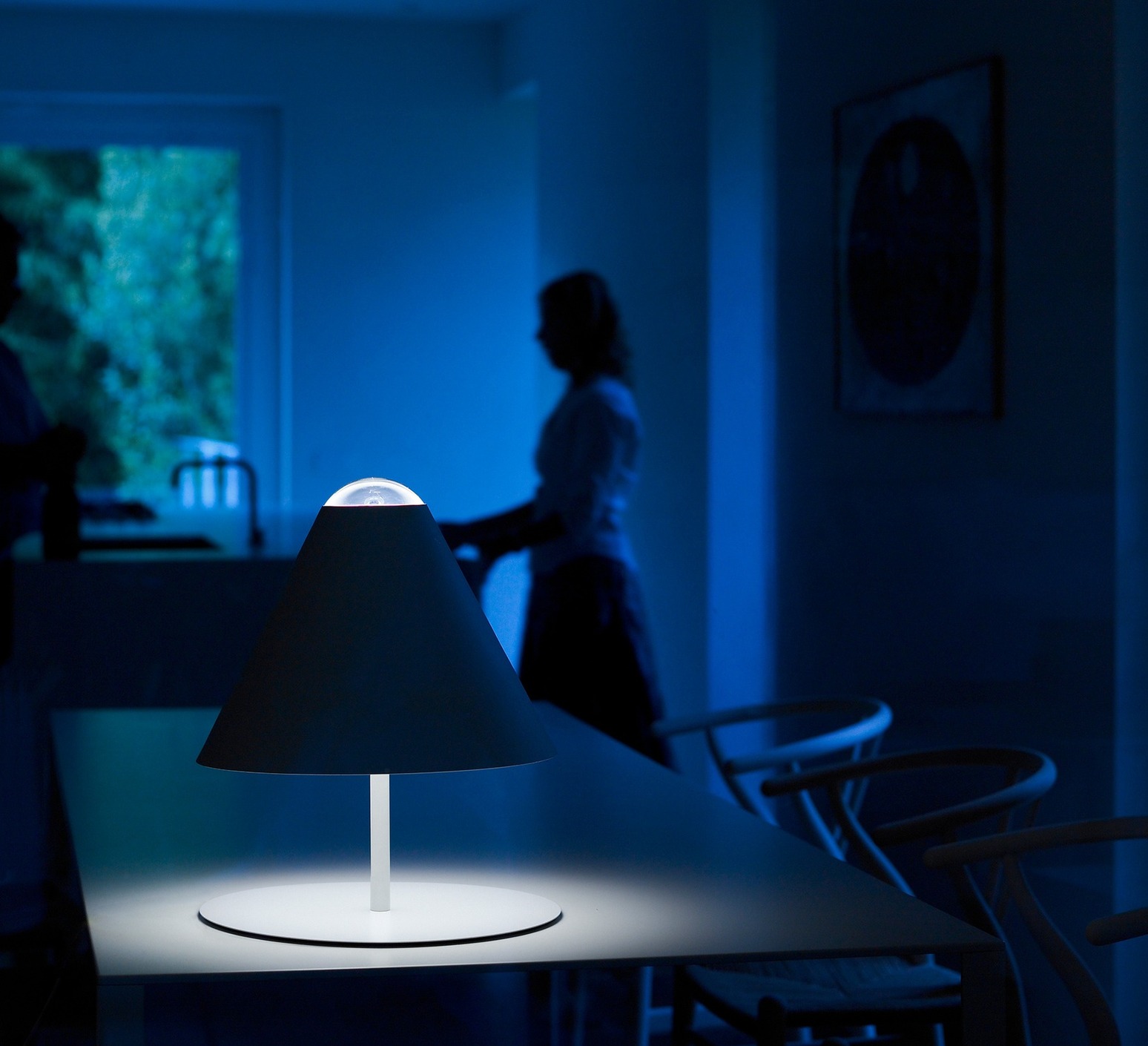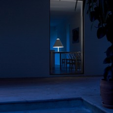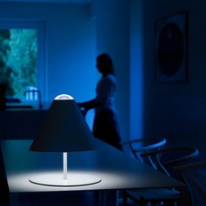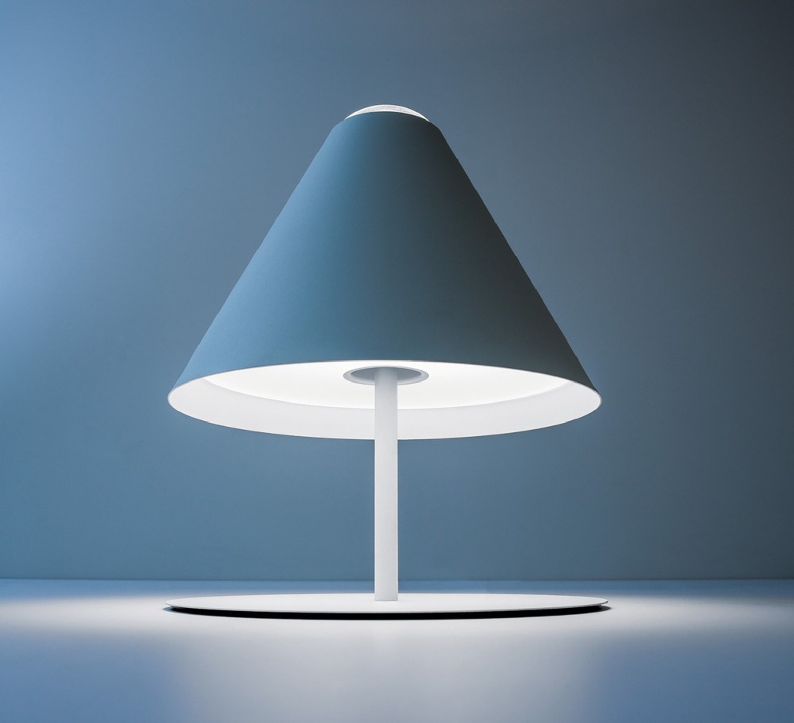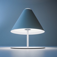 In this creation, the lamp stages light by letting the visible source emanate naturally from beneath the round shade, creating a sculptural luminous presence that combines minimalist design with the subtle sense of humor typical of the brand's creations.