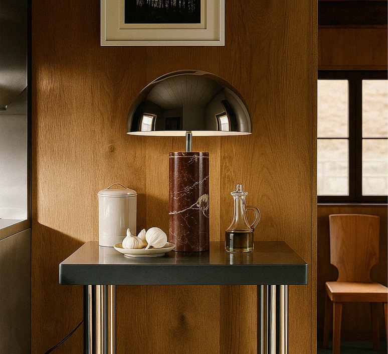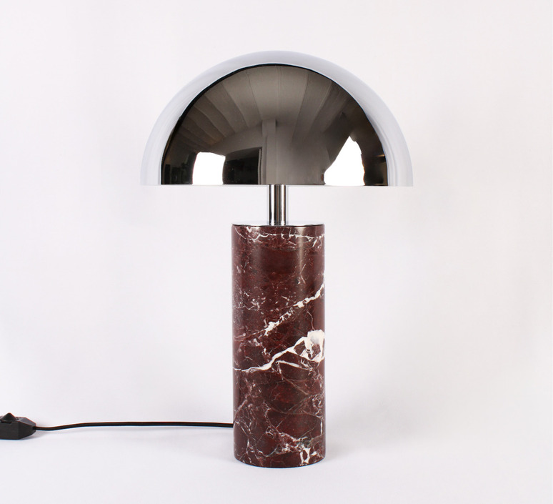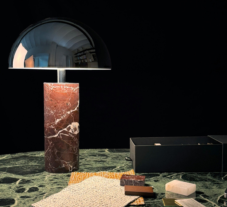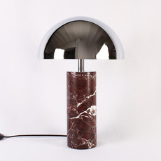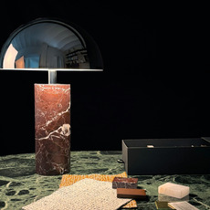The red marble of the base combines with a cylindrical chrome shade to create a subtle contrast between raw material and metallic sheen. This combination gives the lamp a contemporary, singular look, ideal for dressing up a desk, console or side table. Placed alone or in a duo, it creates a muted play of light that emphasizes volumes and enriches the decor with a precious touch.