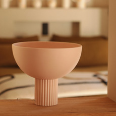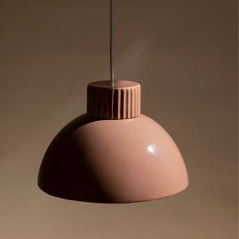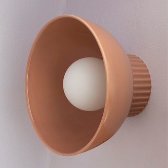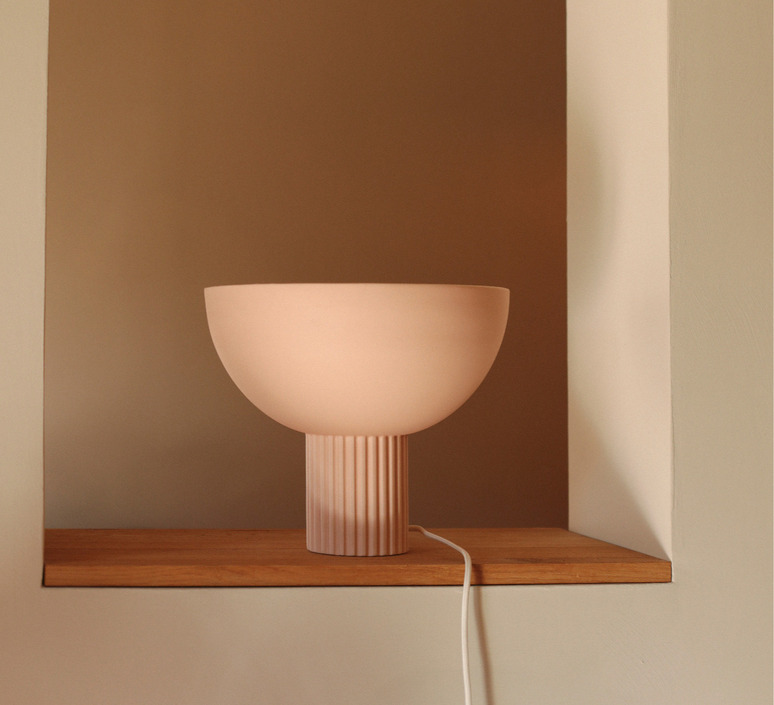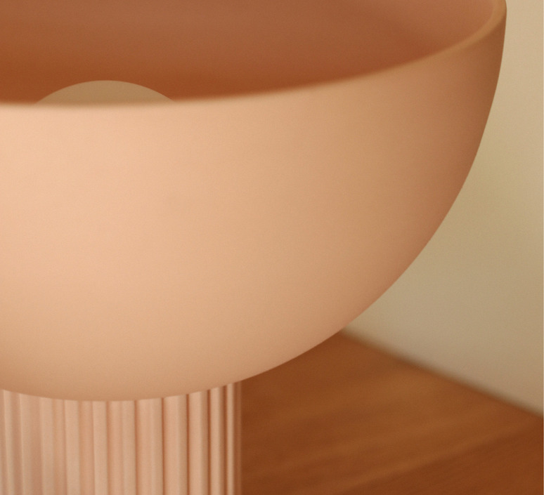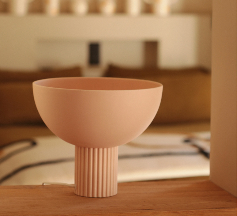 Made from powder-coated ceramic with a matte finish, this circular lamp captures light while playing on reflections. Its low silhouette fits naturally on a side table, console or bedside table. Its warm, glazed color visually warms up spaces with neutral or mineral tones.