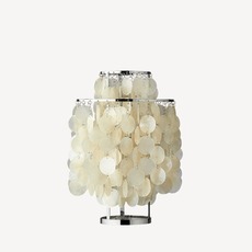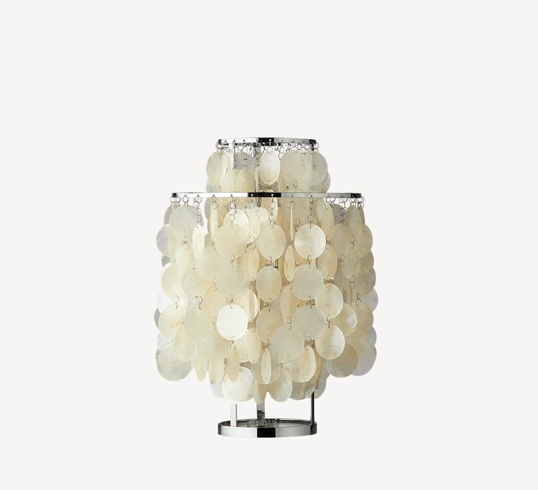 The Fun 2TM table lamp by Verpan, designed by the legendary Verner Panton in 1964, captivates with its structure composed of pearly discs suspended around a circular frame.