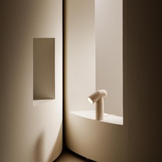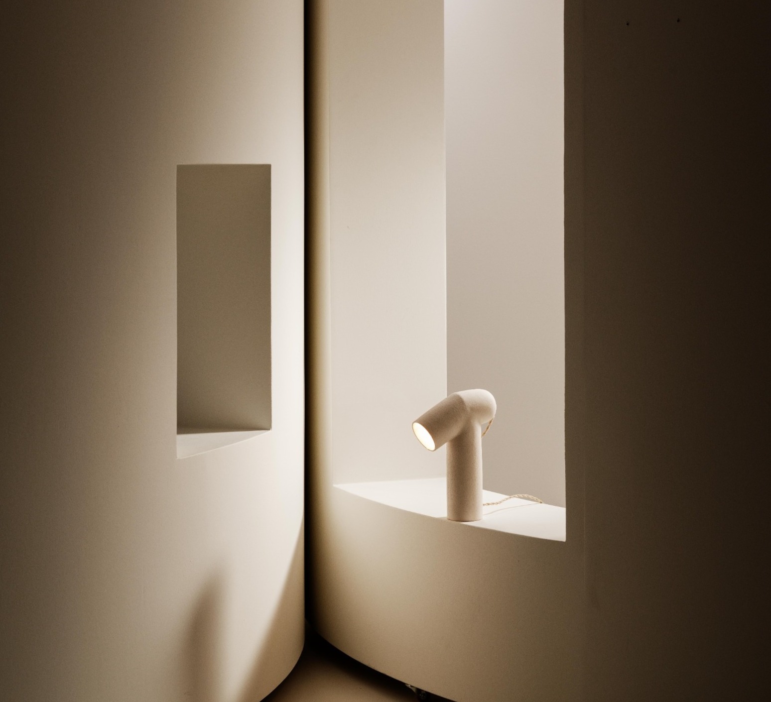 Inspired by the essential shapes of the cylinder and the disc, it is part of a collection evoking the icons of modernist architecture. Its body in chamotte clay, with its raw, organic textures, interacts subtly with light. Maia's soft, diffused lighting casts a delicate glow over its irregular surface.