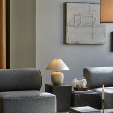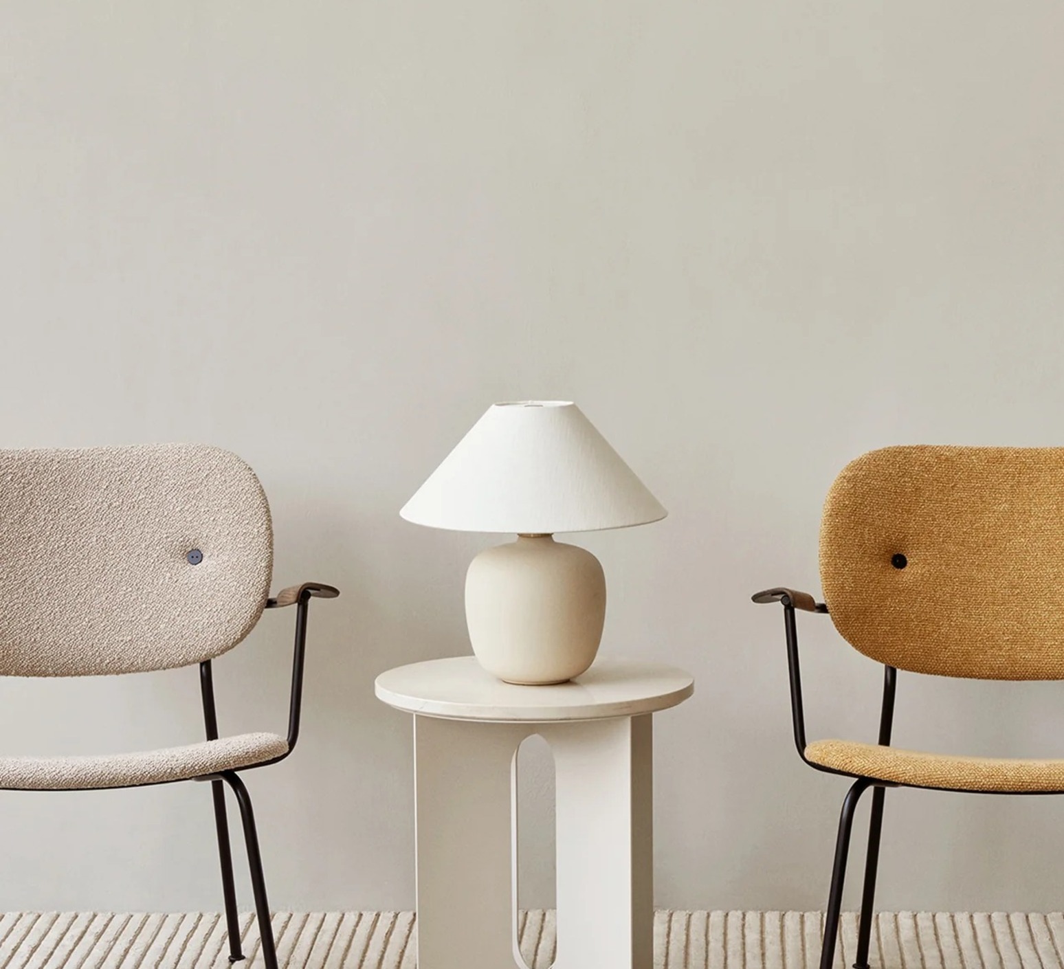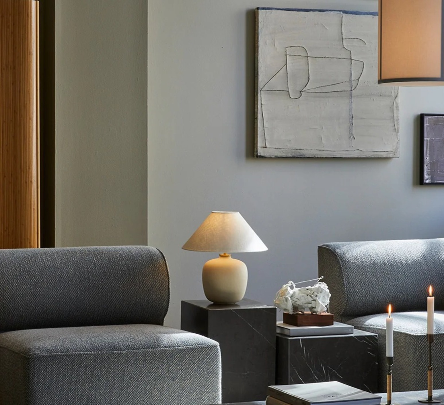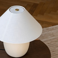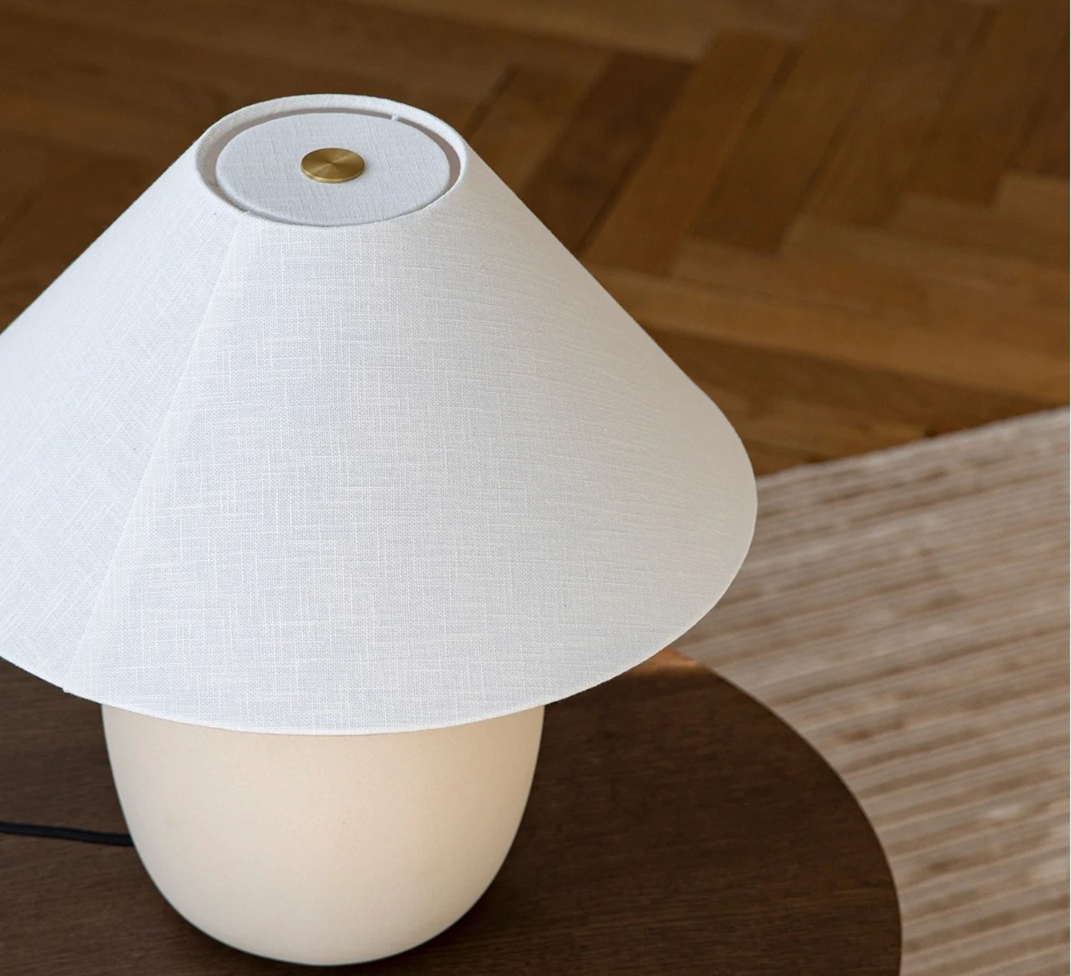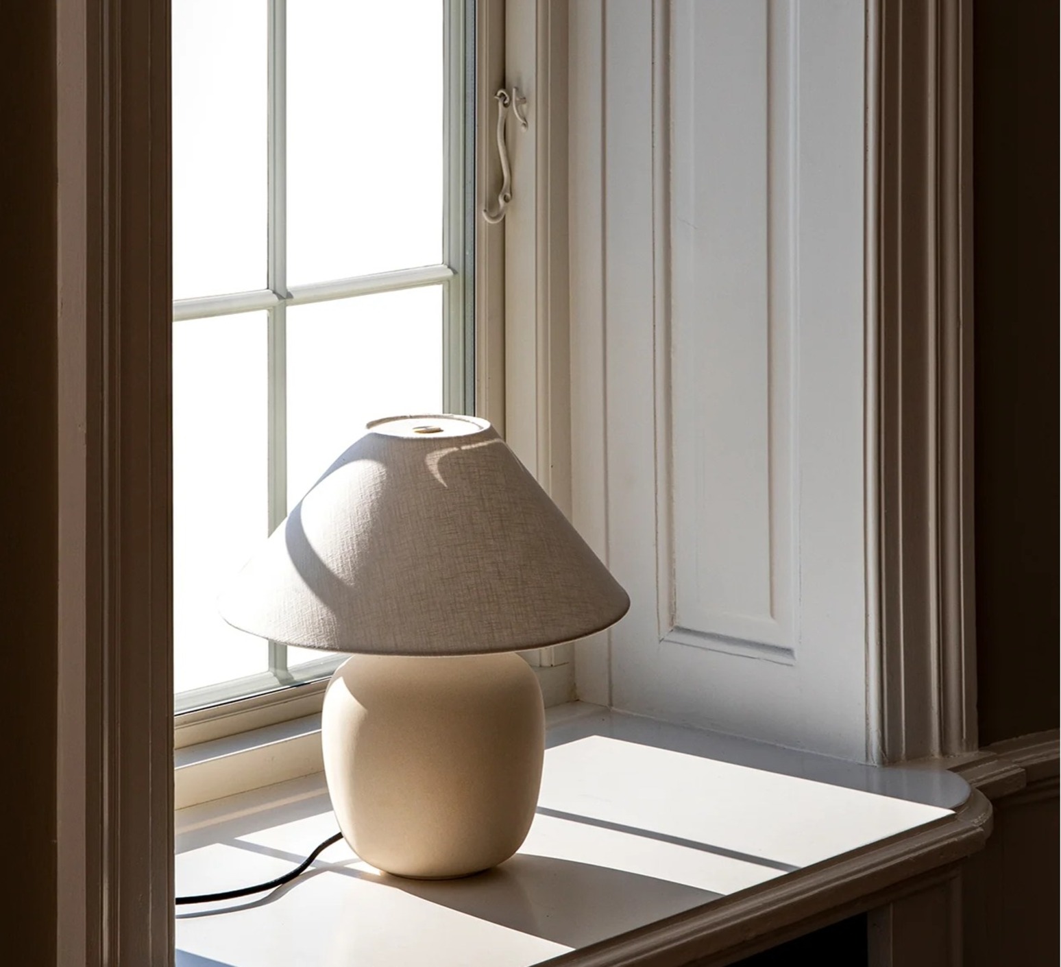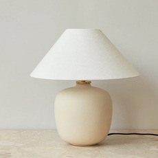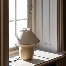 The table lamp features contrasts between raw, unglazed ceramics and airy linen.