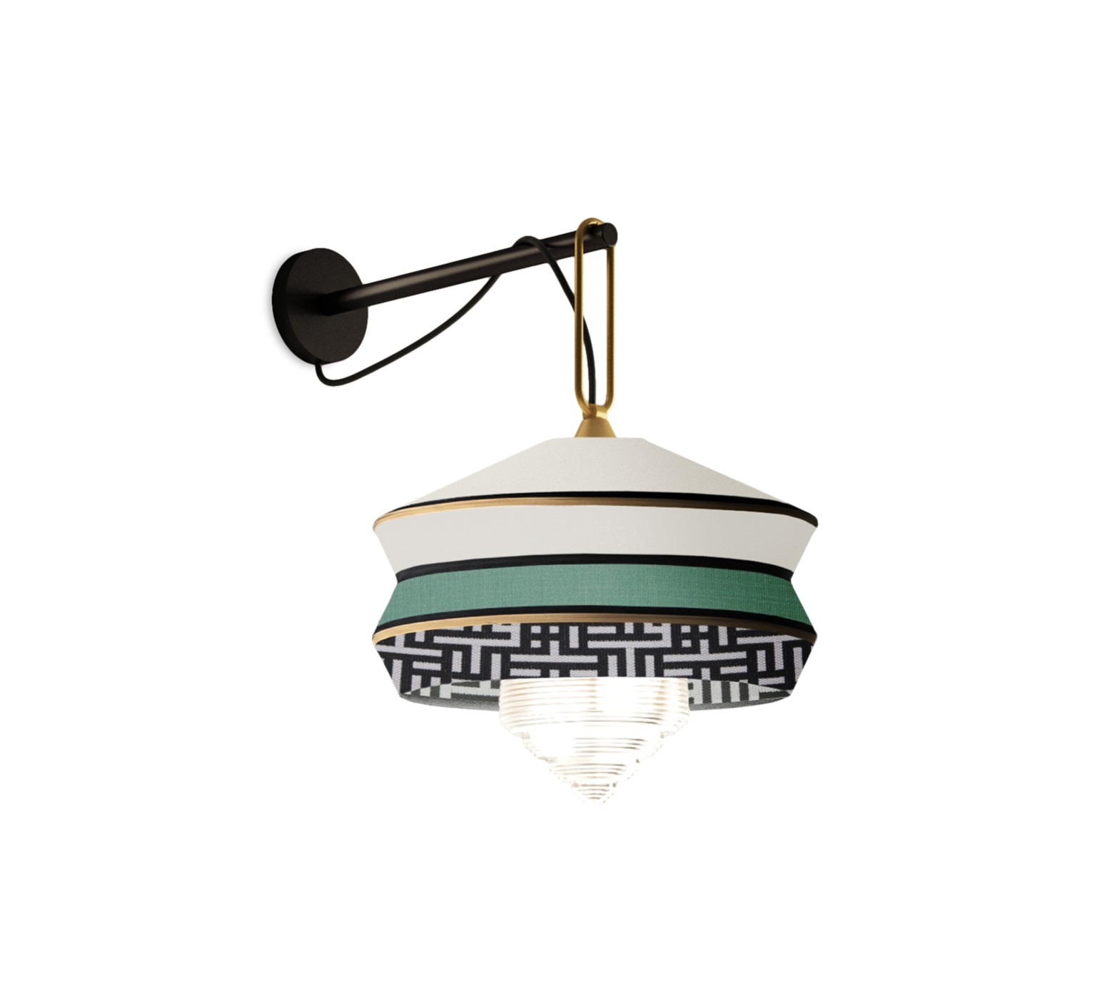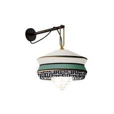 The Calypso Antigua wall sconce by Contardi, designed by Italian studio Servomuto, draws its inspiration from the Art Deco aesthetic of the 1920s, blending textured fabrics with rigorous geometric patterns and bright colors inspired by South American and tropical culture.