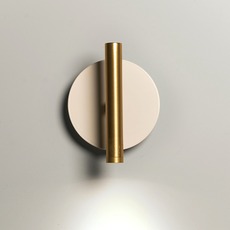 This decorative luminaire with its pure geometric design is made of aluminum and steel with a brass and white finish. Designed for modern interiors, this sconce combines technology and aesthetics, reflecting the innovation of Italian design.
