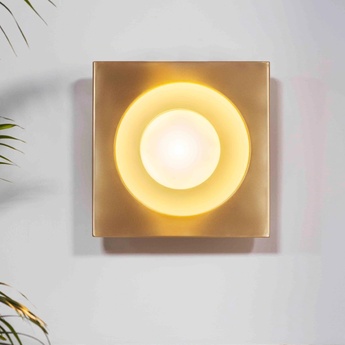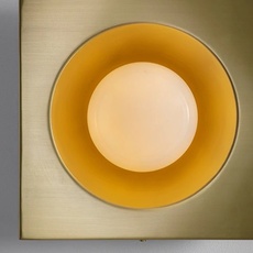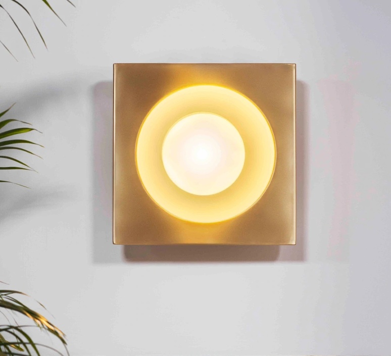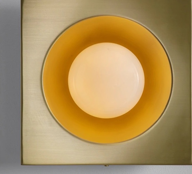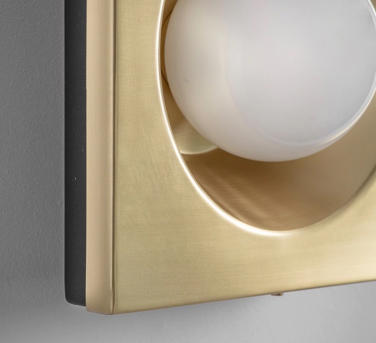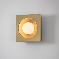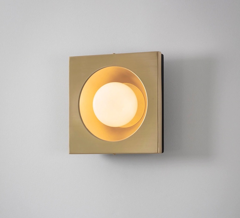This now versatile sconce has a square brass reflector with an opal glass globe in the center, creating a warm and generous glow.