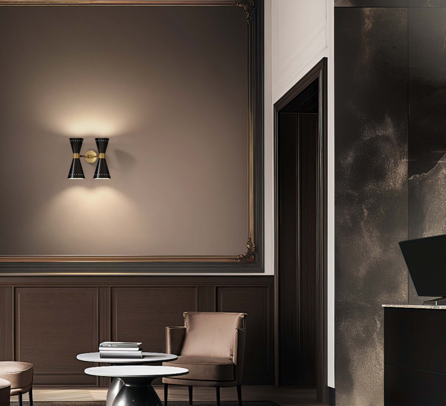 Emblematic of the 1950's, the Megafono wall lamp provides both direct and indirect light. It combines a precious brass structure with galvanic gilding with one or two adjustable cones in glossy ivory or black, lighting the room with elegance.