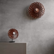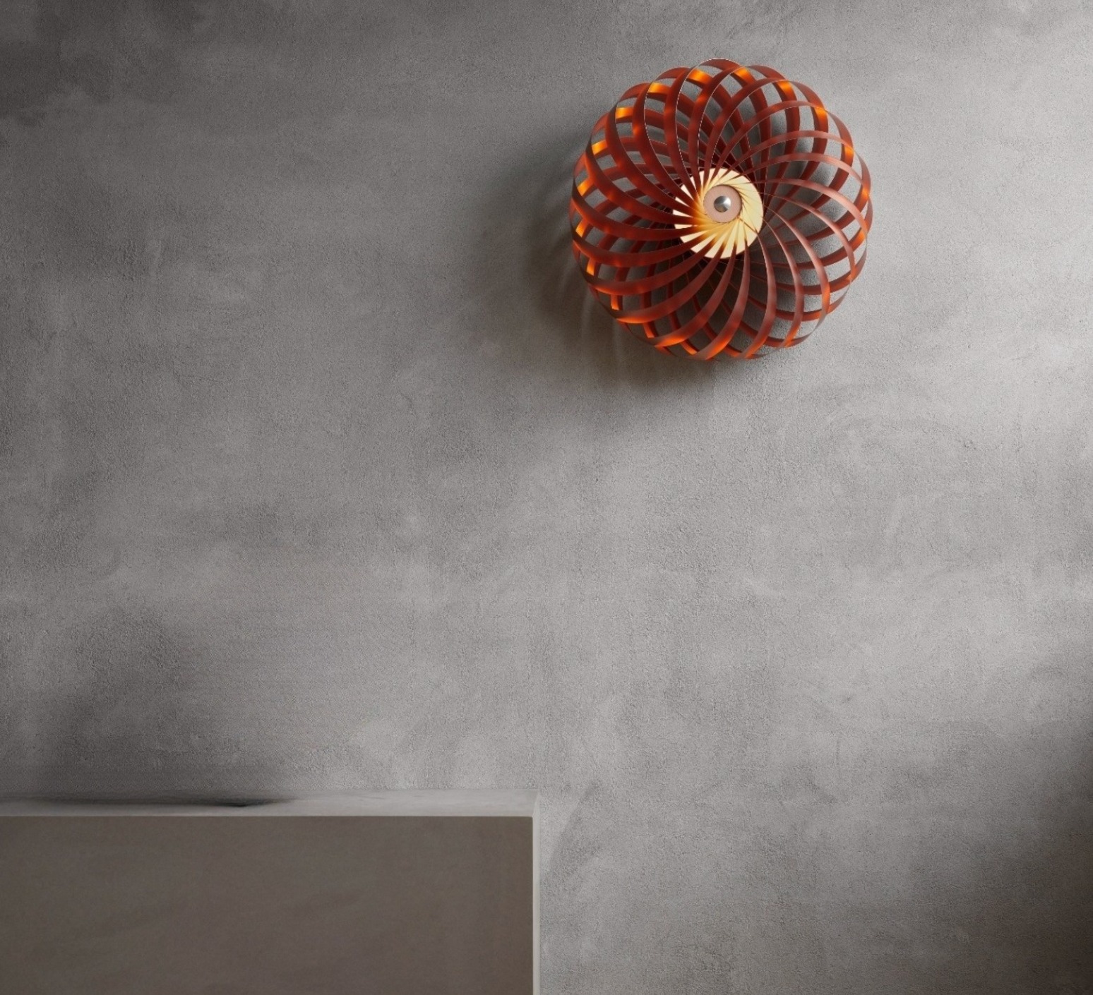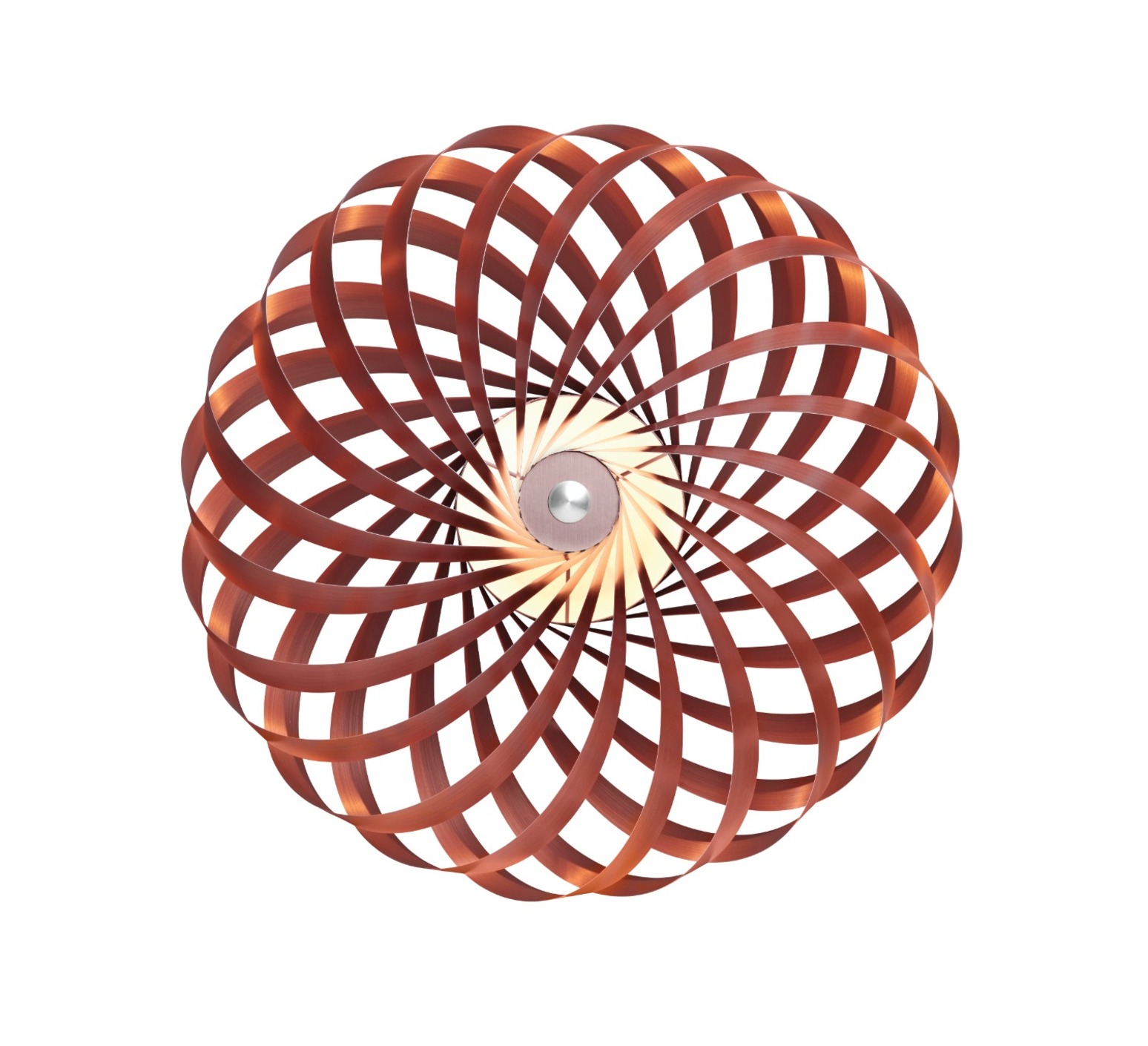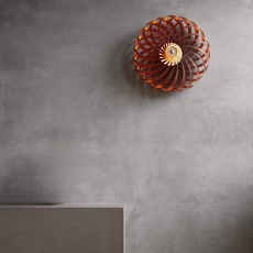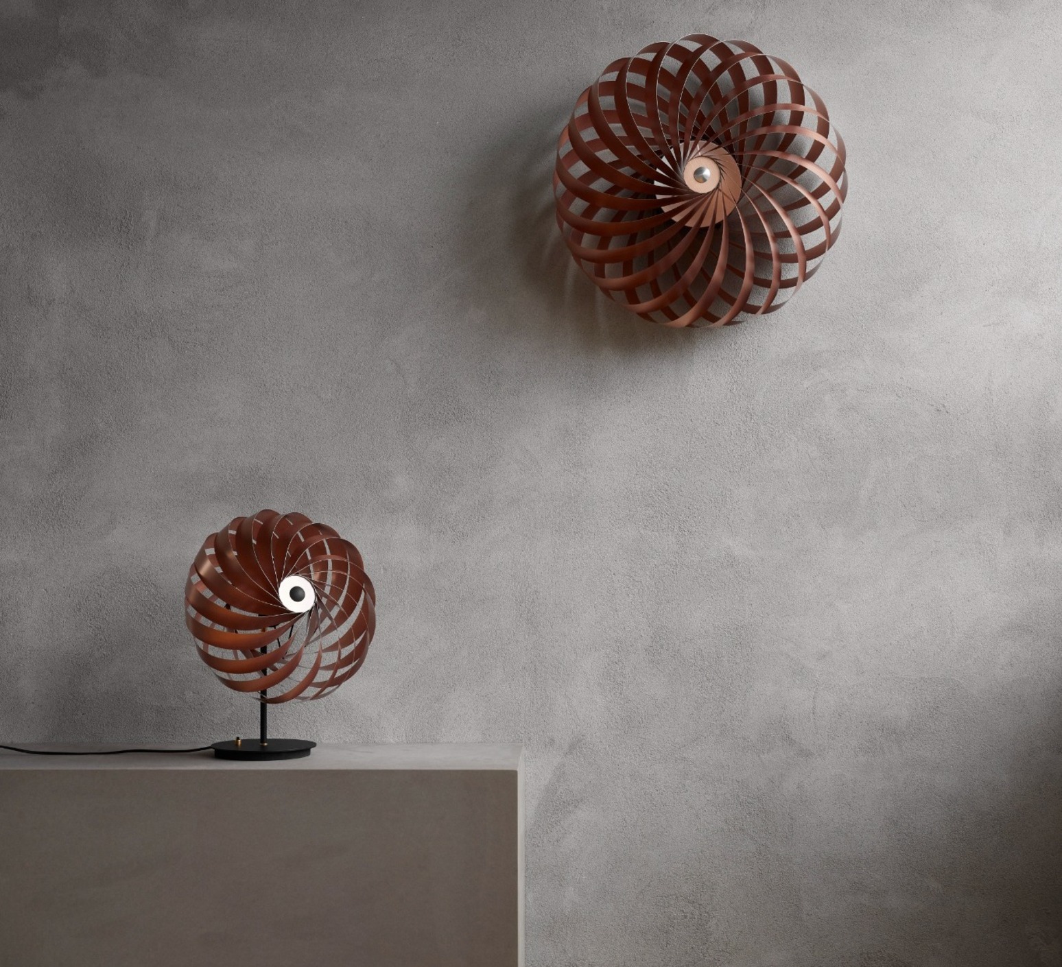 The TR5 luminaire features a wall bracket and a circular shade made of copper-finished aluminum slats. Enchanting and natural, the TR5 wall light is ideal for every interior, whether on the walls of an entrance or a living room.