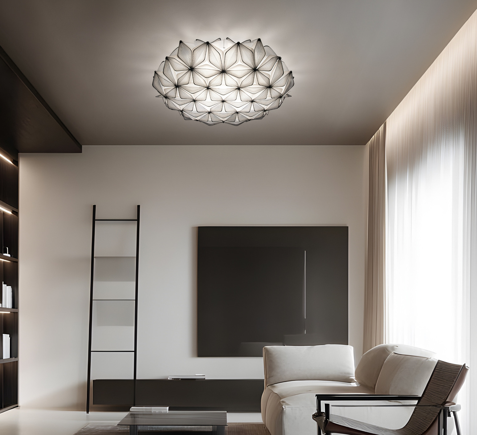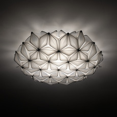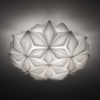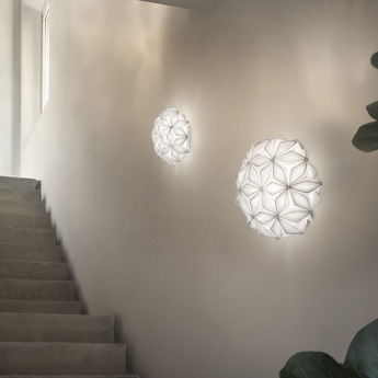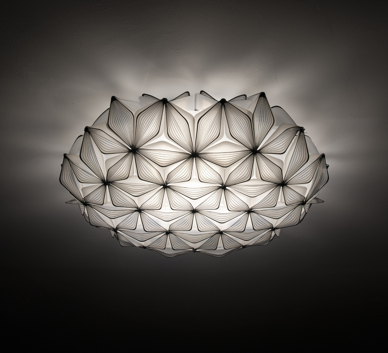Its extended spherical shape and black finish visually structure space with clarity. The screen-printed petals create a balanced volume that catches the eye without overloading. Whether as a wall or ceiling fixture, this luminaire blends naturally into contemporary interiors, offices or public spaces, where it interacts with clean architecture and sober materials.