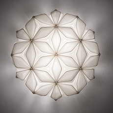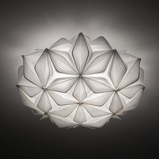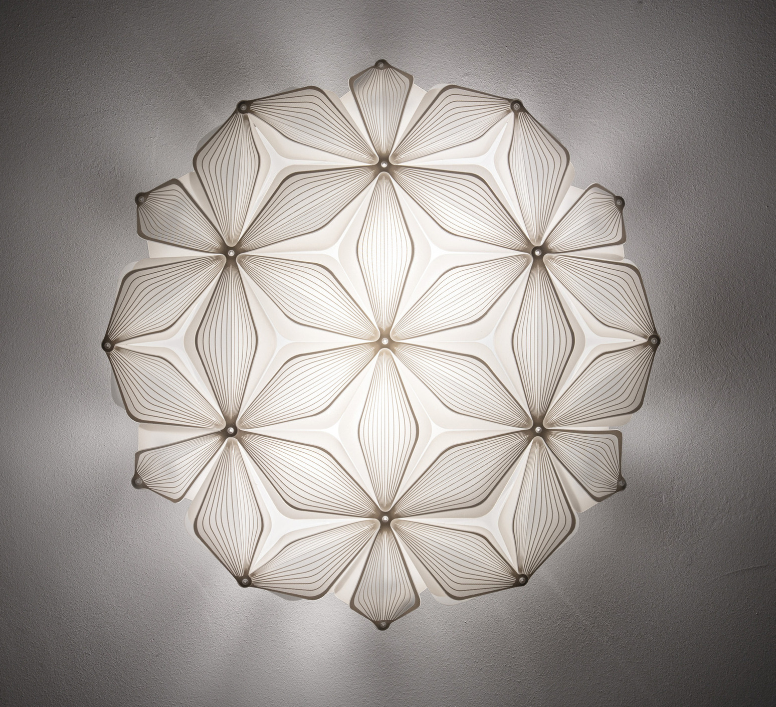 Its extended spherical shape and white finish visually structure space with clarity. The screen-printed petals create a balanced volume that catches the eye without overloading. Whether as a wall or ceiling fixture, this luminaire blends naturally into contemporary interiors, offices or public spaces, where it interacts with clean architecture and sober materials.