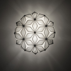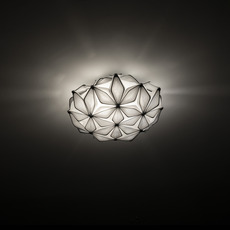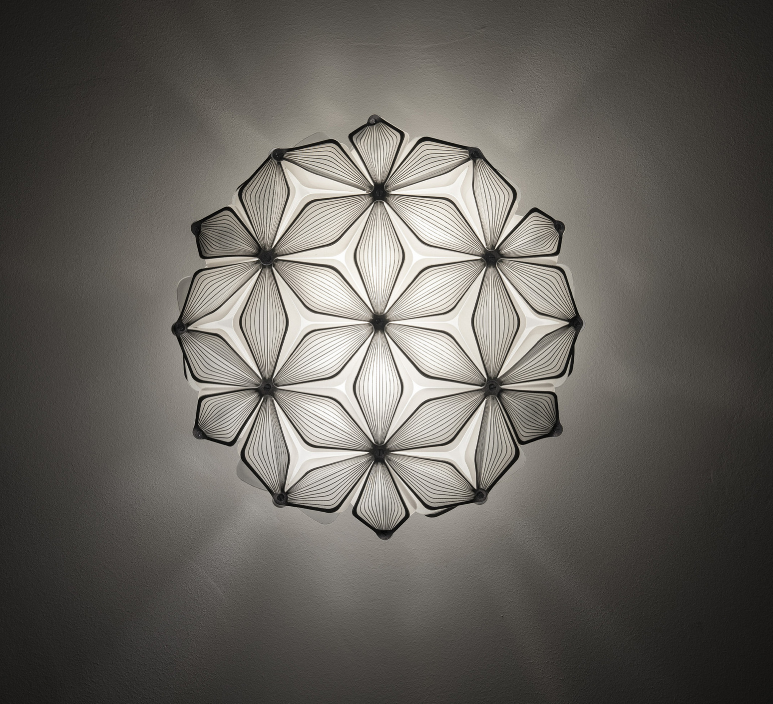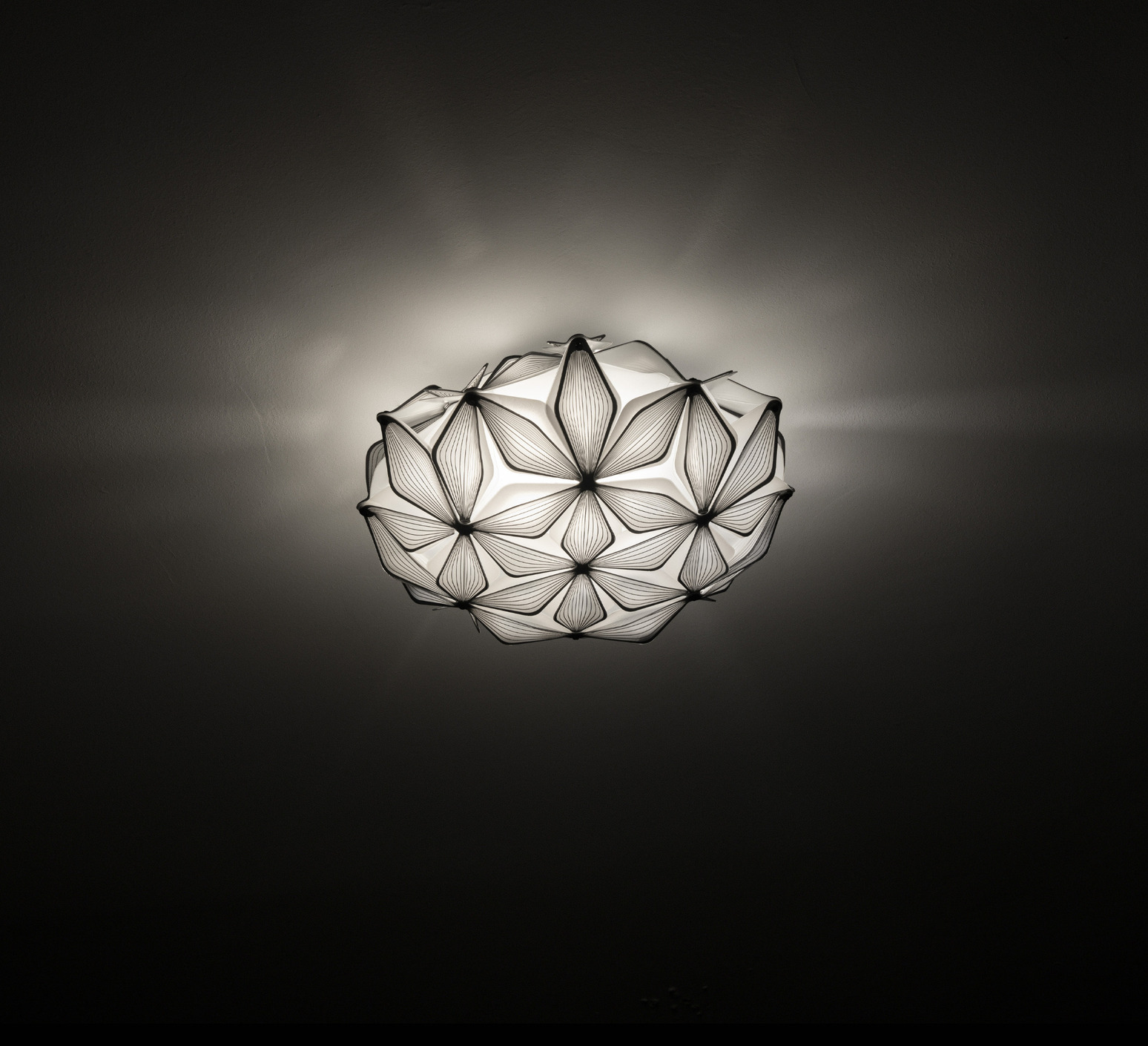Its extended spherical shape and black finish visually structure space with clarity. The screen-printed petals create a balanced volume that catches the eye without overloading. Whether as a wall or ceiling fixture, this luminaire blends naturally into contemporary interiors, offices or public spaces, where it interacts with clean architecture and sober materials.