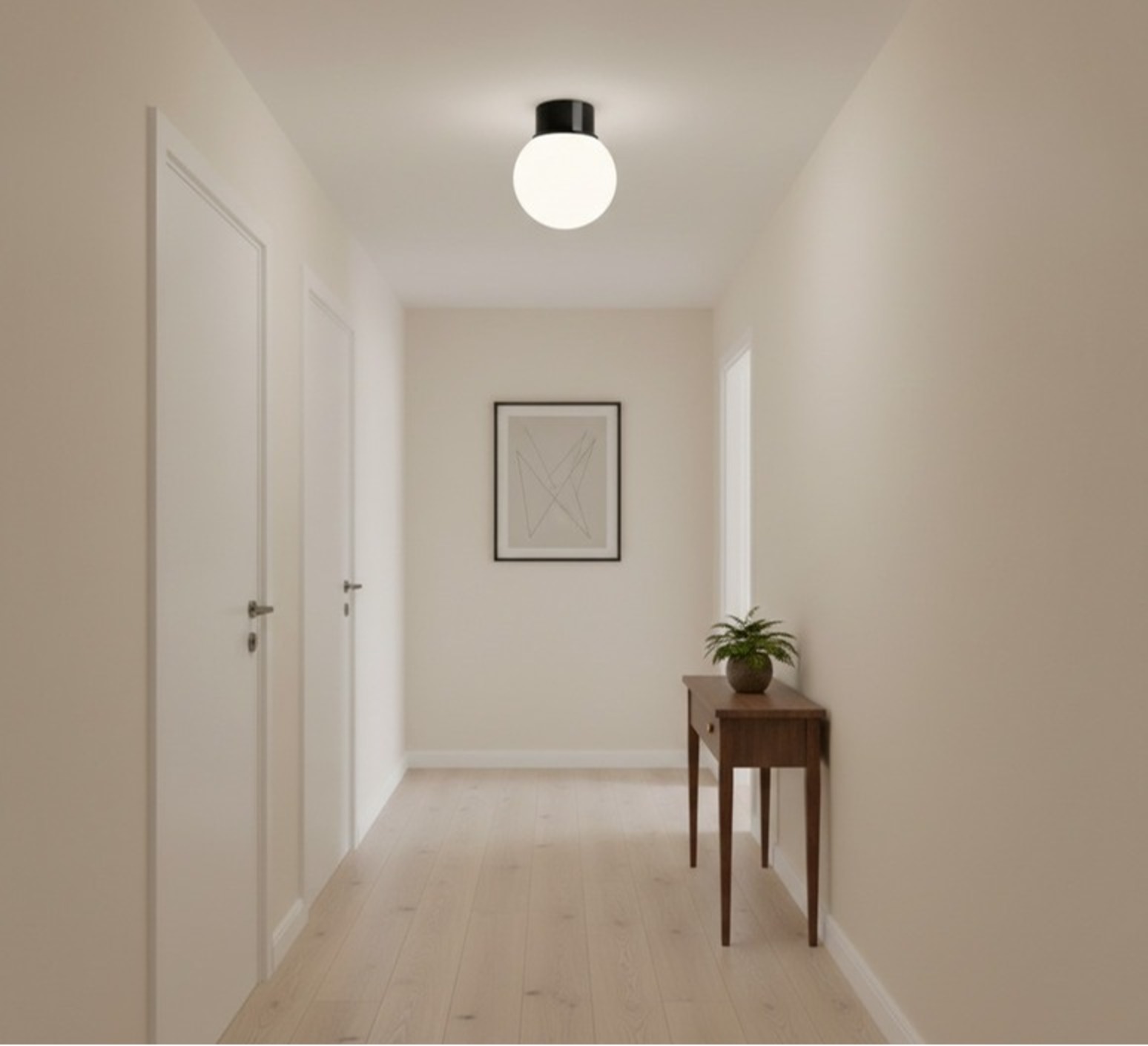 The E27 LED bulb with a maximum wattage of 6W is not supplied, but is necessary for the luminaire to work properly. Screws are not supplied for this product, as the type of screw depends on the wall or ceiling material (concrete, brick, plaster, wood...). This lamp is supplied with a 7 cm diameter flush-mounting box (not mandatory for installation).