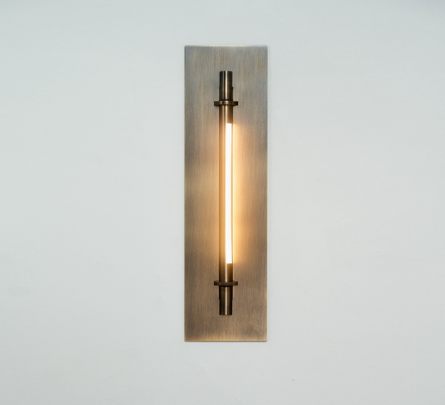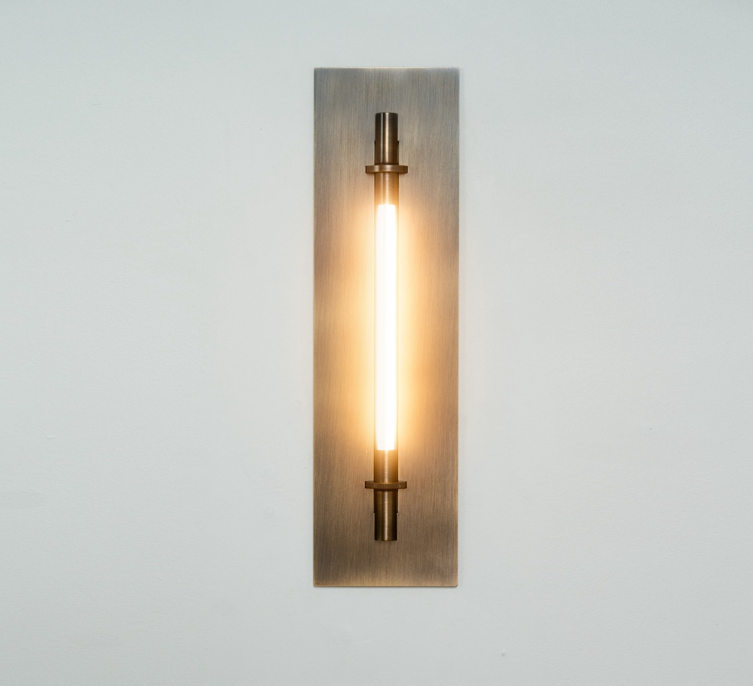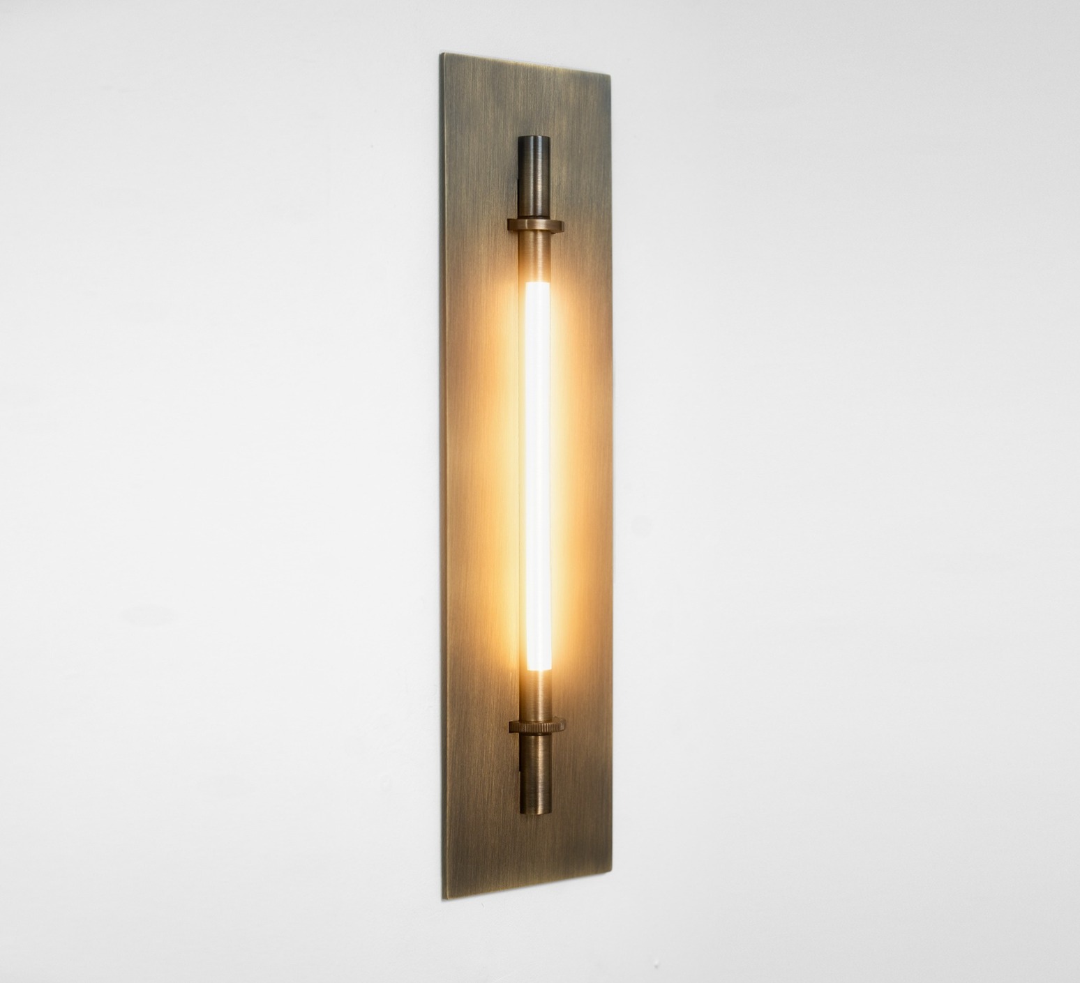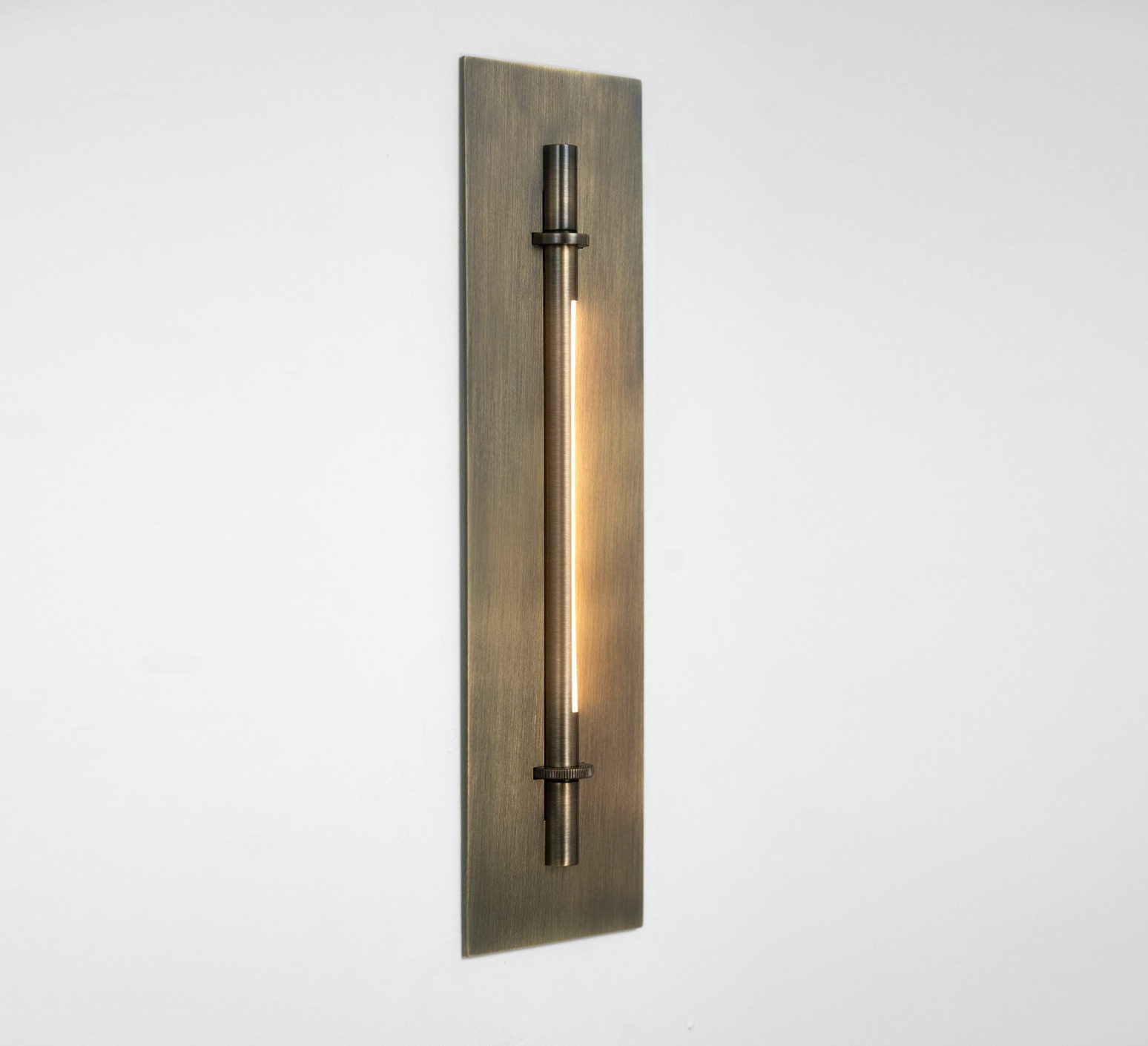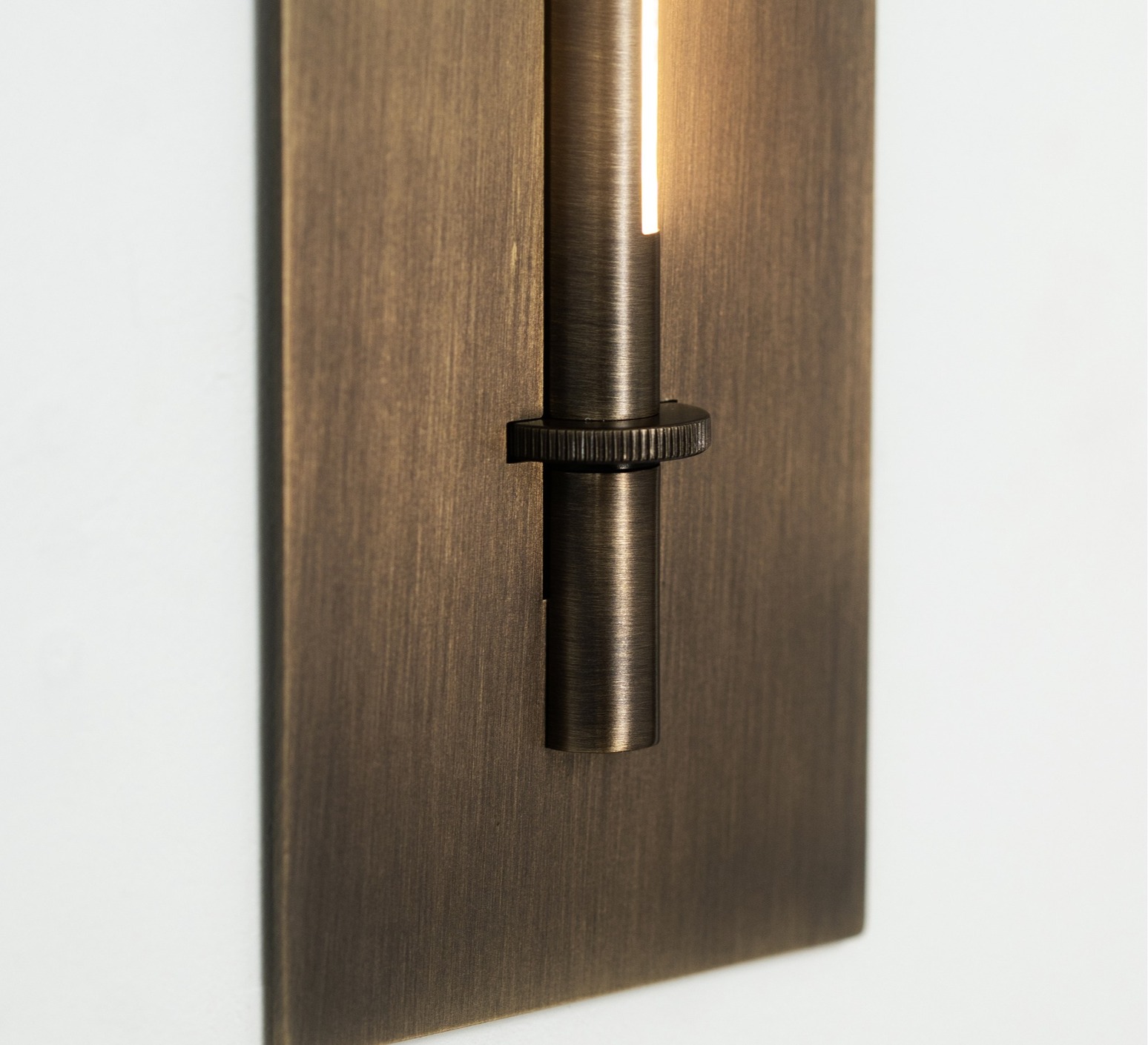 Fabricado en latón macizo con acabado en bronce, está pensado para interiores contemporáneos que buscan una luz discreta y duradera que se integre perfectamente en la arquitectura.