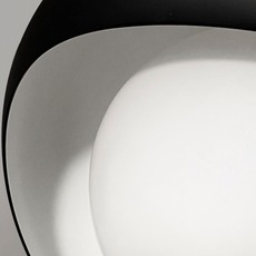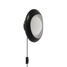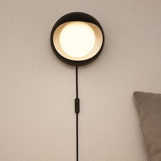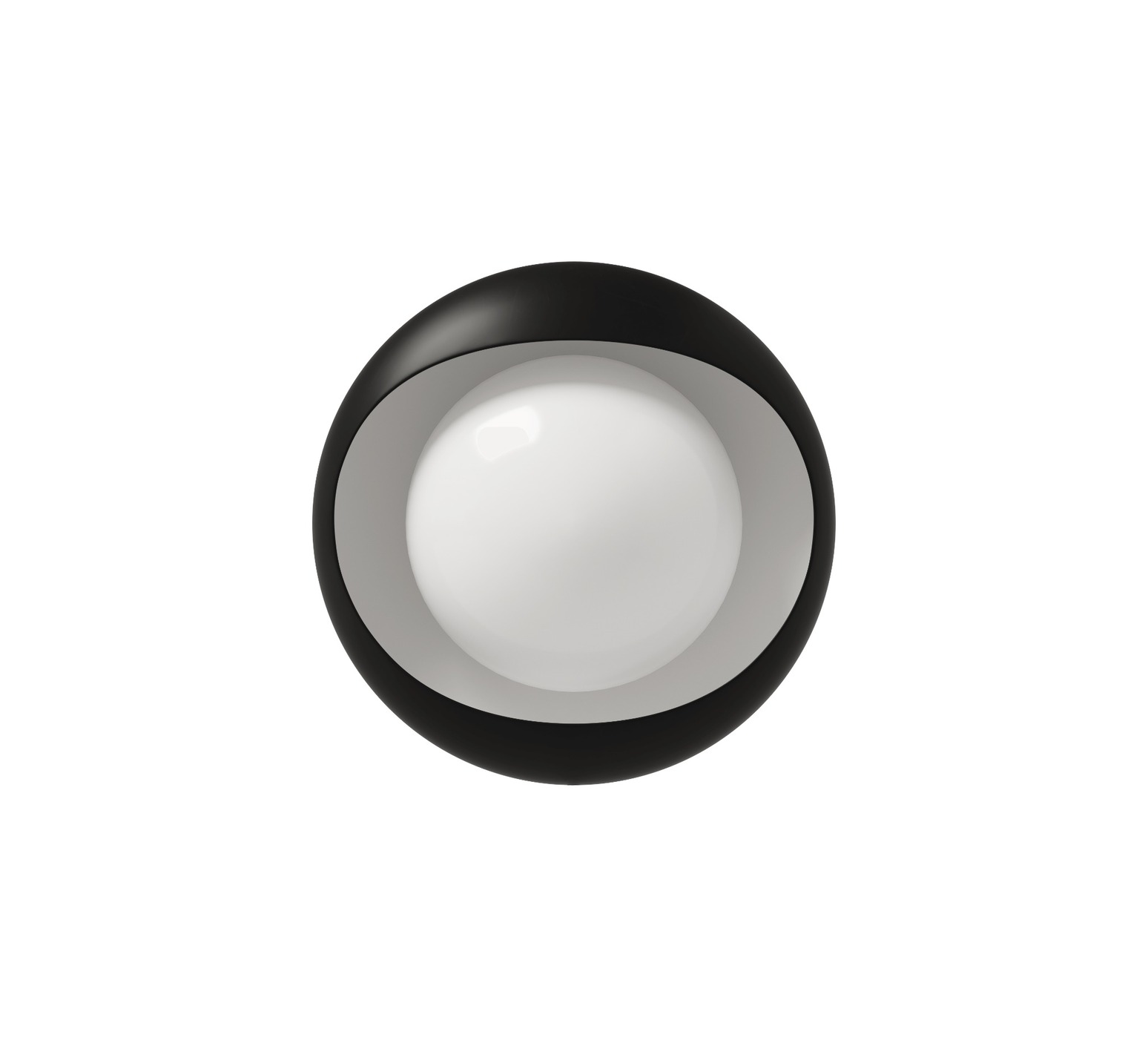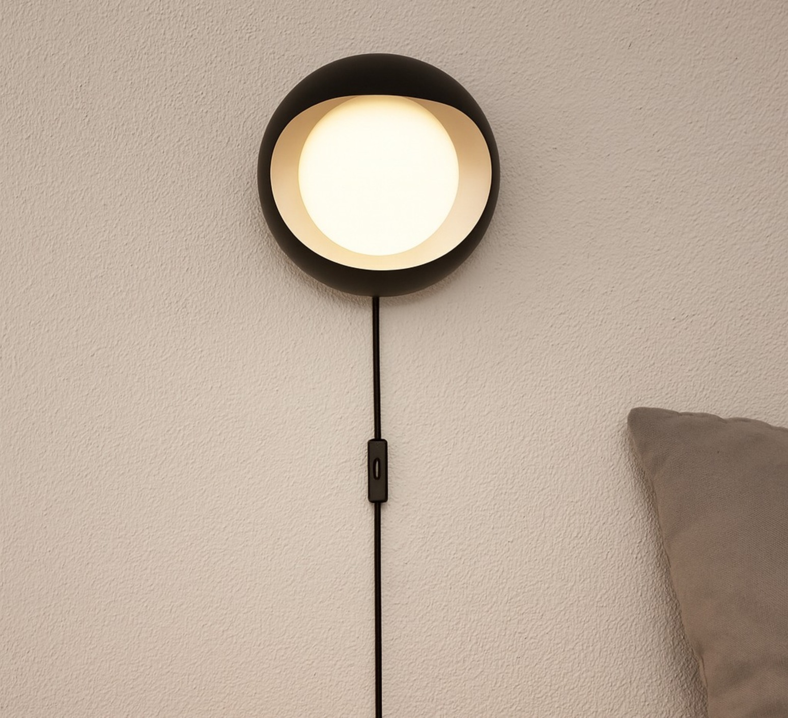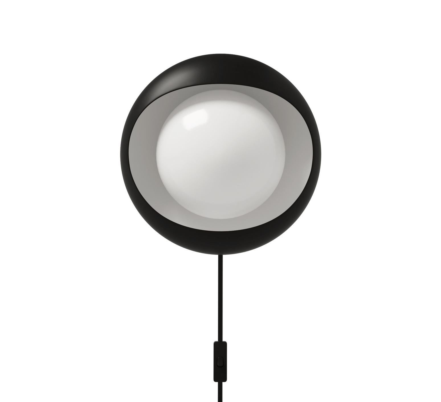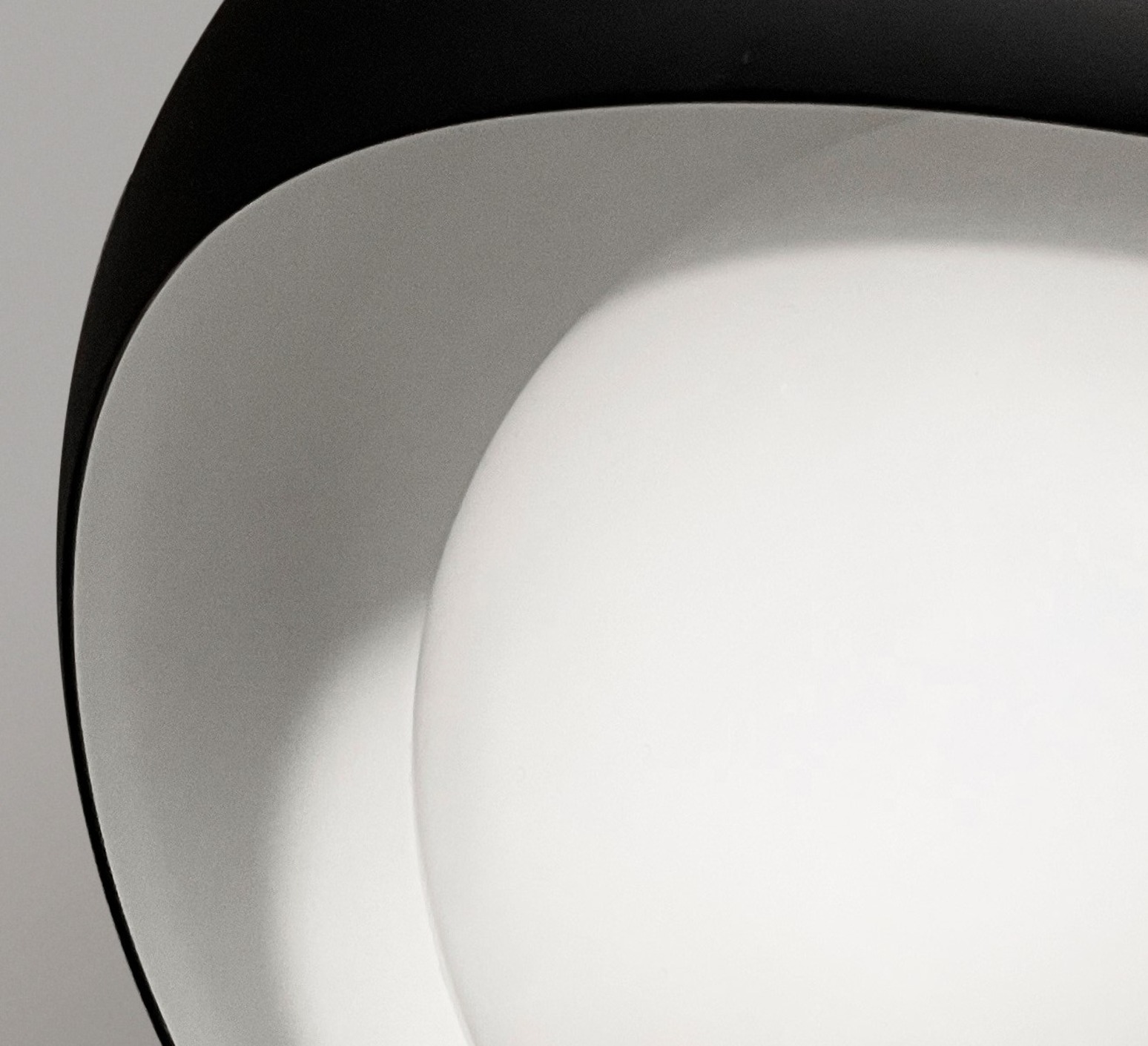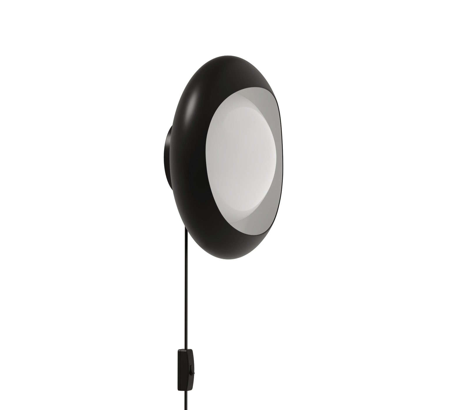 El aplique Cornea 220 tiene forma circular y combina un difusor de cristal opalino con una carcasa exterior asimétrica de acero pintado de negro. Esta construcción crea un juego de aberturas que recuerda a dos párpados envolviendo la luz. Su iluminación difusa a 360° queda muy bien en interiores escandinavos o contemporáneos, en la cabecera de una cama, en un pasillo o encima de un mueble. El cable negro con interruptor puede ocultarse o cortarse para una conexión directa a la pared, en función de las necesidades de instalación (si se corta el cable, se anula la garantía).
