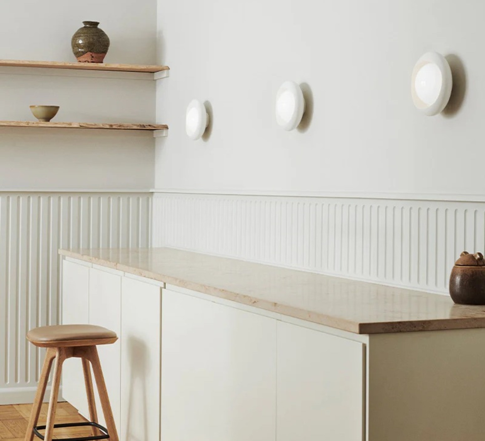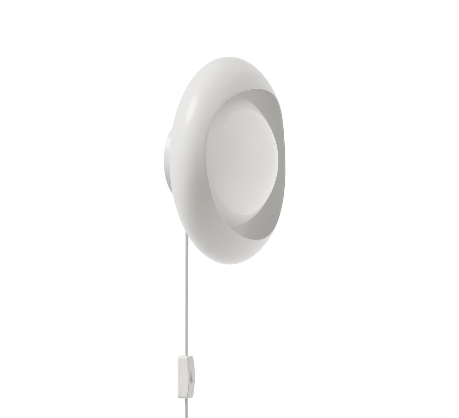 El aplique Cornea 220 tiene forma circular y combina un difusor de cristal opalino con una carcasa exterior asimétrica de acero pintado de blanco. Esta construcción crea un juego de aberturas que recuerda a dos párpados envolviendo la luz. Su iluminación difusa a 360° quedará genial en un interior escandinavo o contemporáneo, en la cabecera de una cama, en un pasillo o encima de un mueble. El cable blanco con interruptor puede ocultarse o cortarse para una conexión directa a la pared, en función de las necesidades de instalación (si se corta el cable, se anula la garantía).