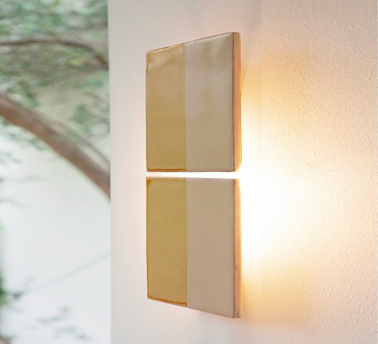 El aplique Tiles Line J adopta la forma de 2 azulejos de cerámica serigrafiados en blanco y amarillo. La luminaria está hecha a mano en un taller de Portugal. Detrás de estos cuadrados se coloca una bombilla que difunde una luz indirecta. La luminaria es bicolor gracias a un patrón simétrico en cada azulejo, lo que le confiere un aspecto más geométrico.